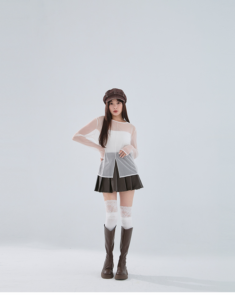 S~L身形實測!分尺寸皺皺木耳邊透膚高領長袖上衣