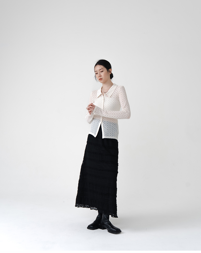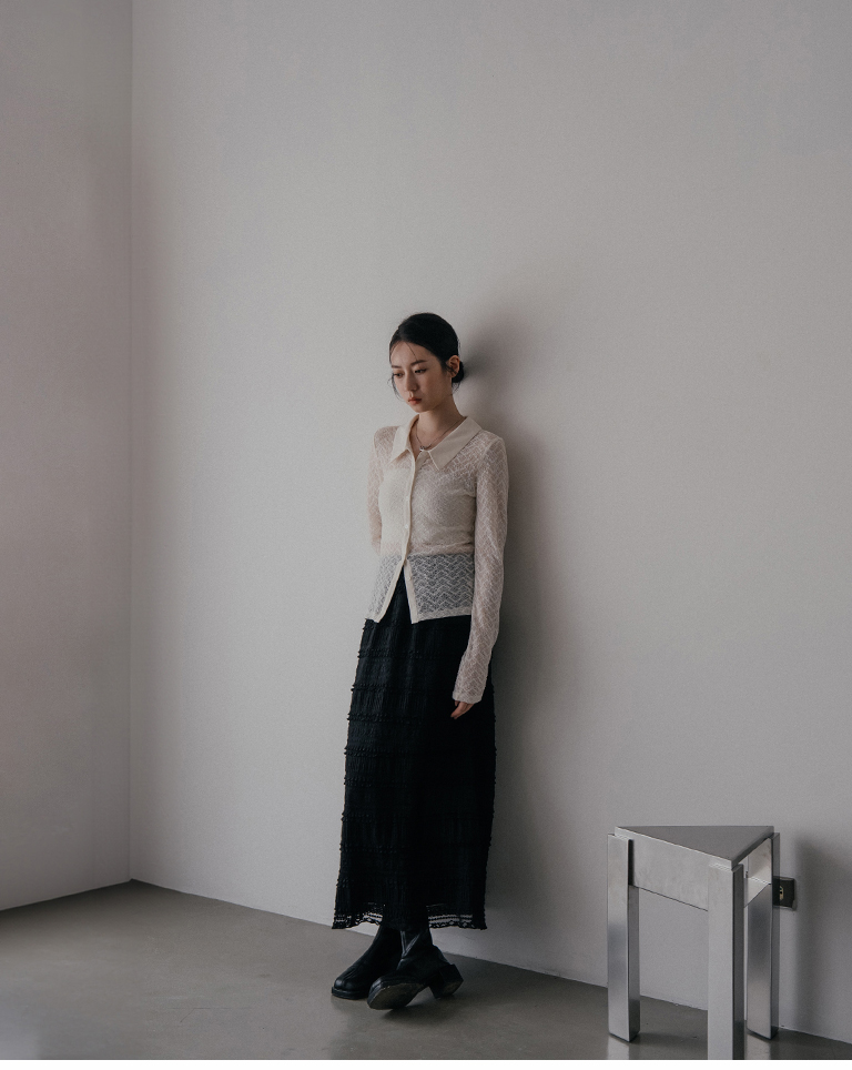 S~L身形實測!分尺寸皺皺木耳邊透膚高領長袖上衣