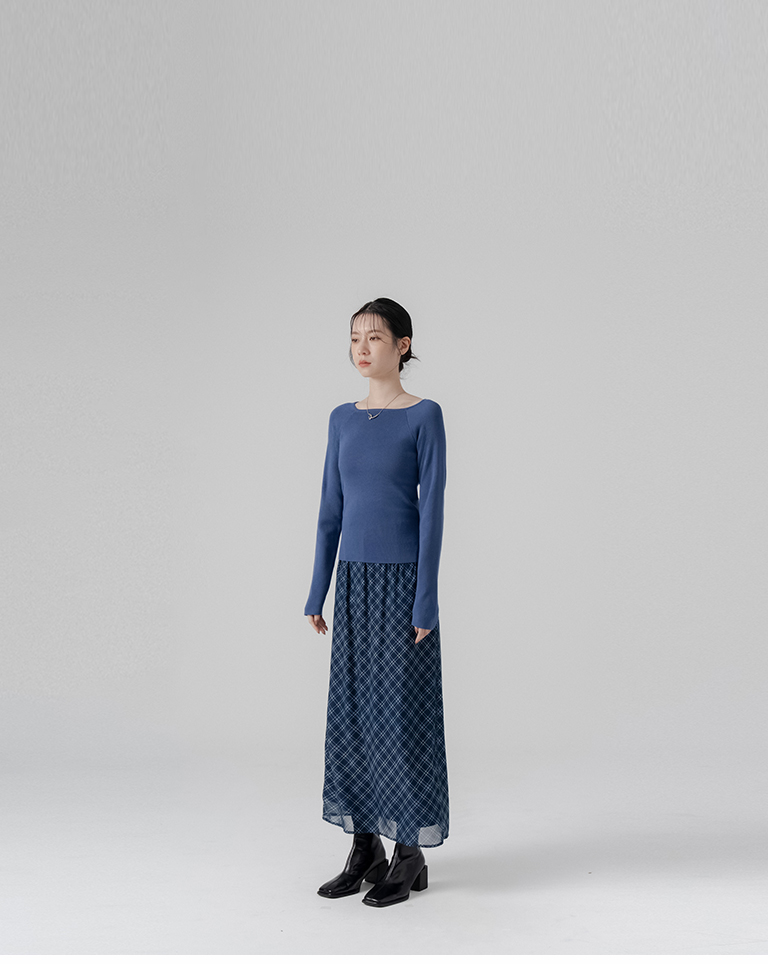 格紋透紗雙層彈性長裙-藍 S/M