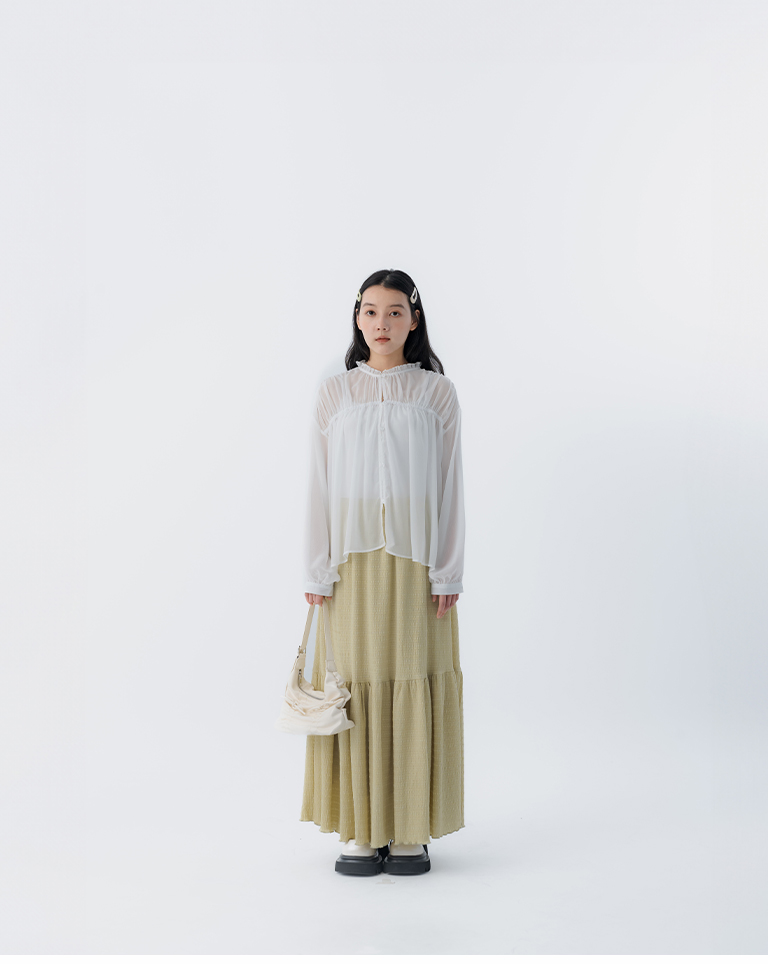 S~L身形實測!分尺寸皺皺木耳邊透膚高領長袖上衣