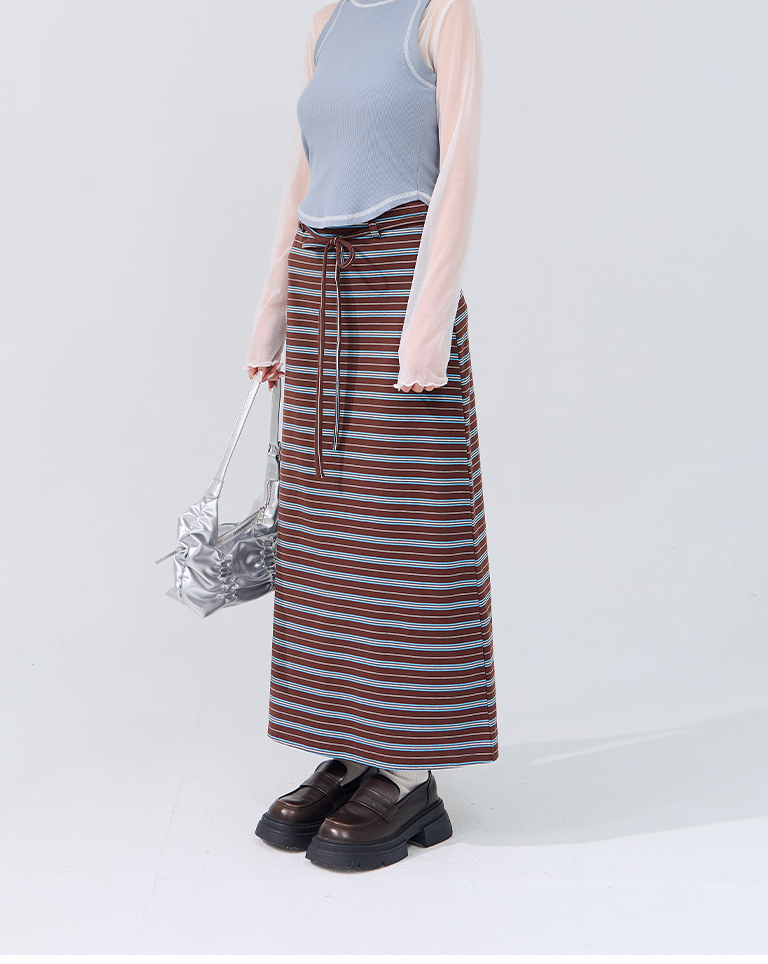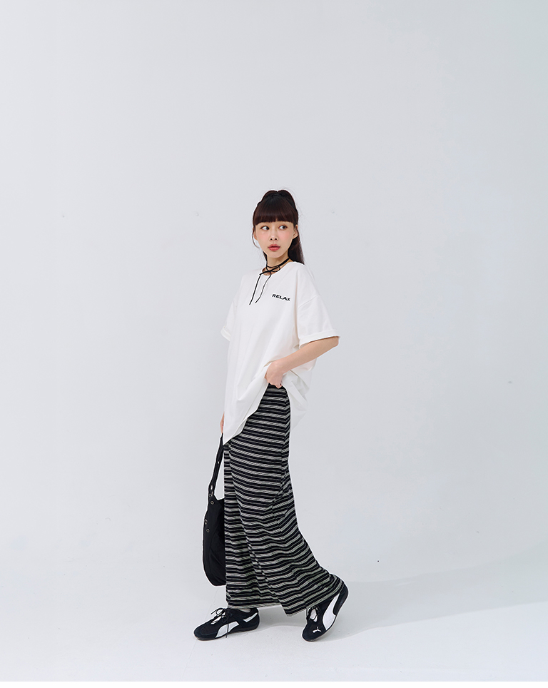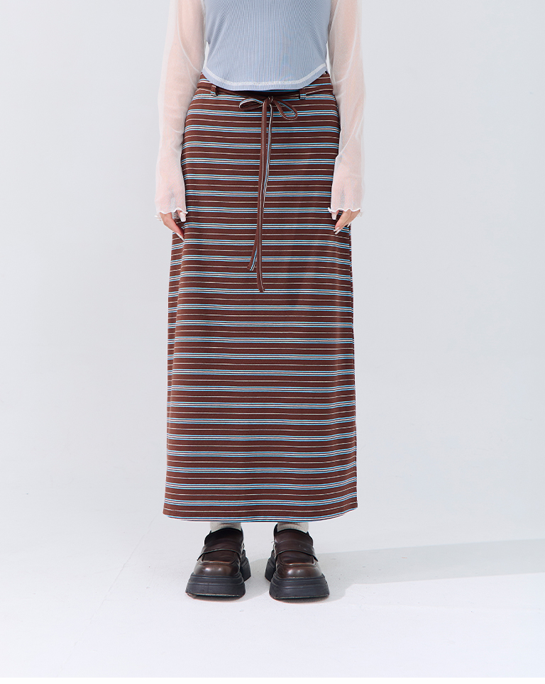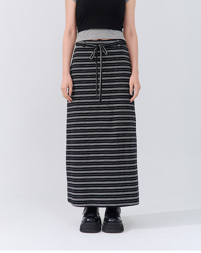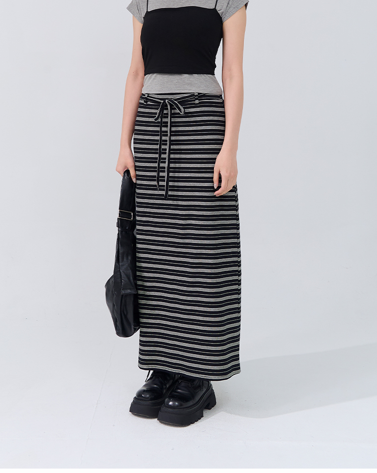 休閒條紋直筒棉質長裙附腰帶 兩色售 S-L