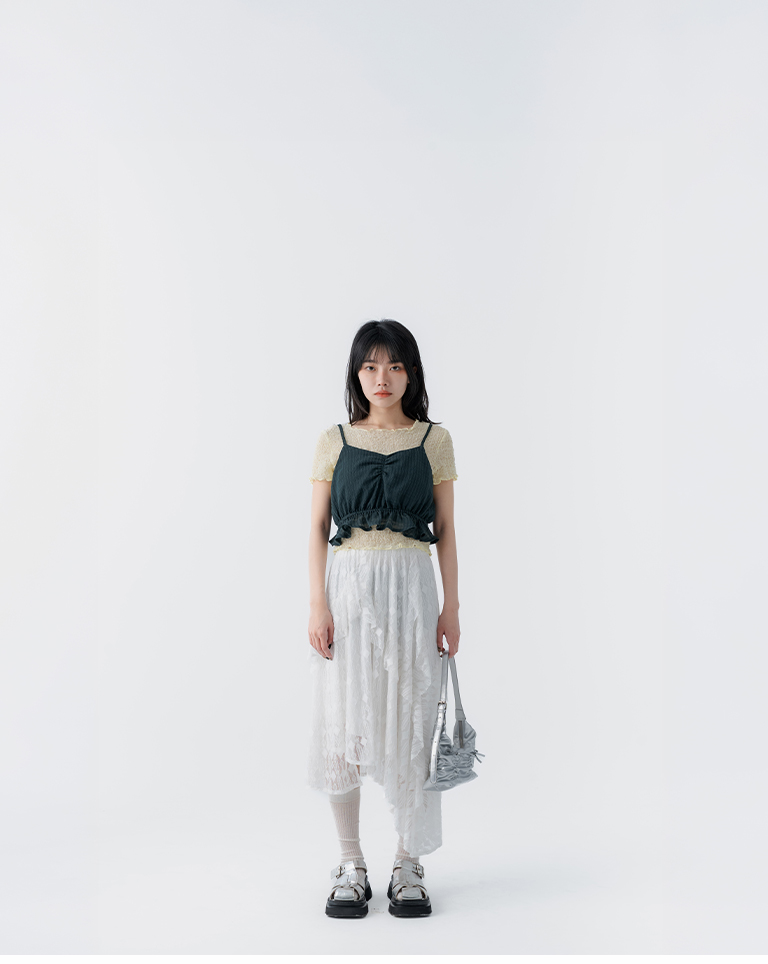 搭配蕾絲上衣 整體造型優雅中帶點浪漫氛圍