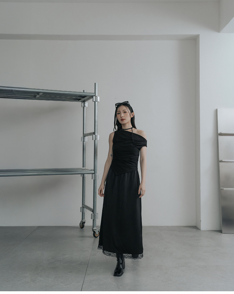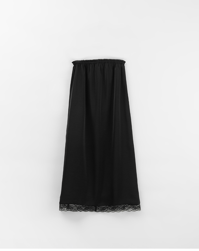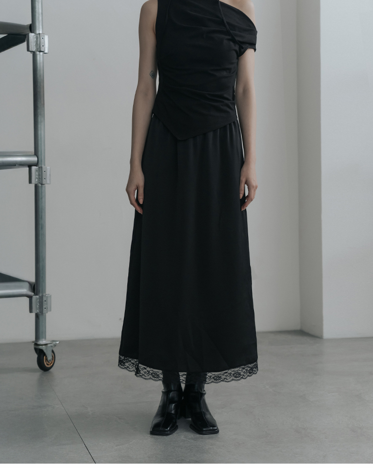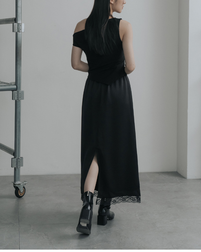 蕾絲鏤空裙襬設計緞面長裙-黑 S/M