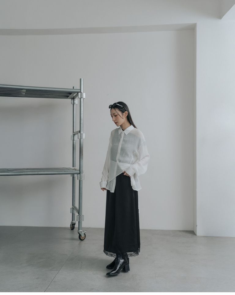 S~L身形實測!分尺寸皺皺木耳邊透膚高領長袖上衣