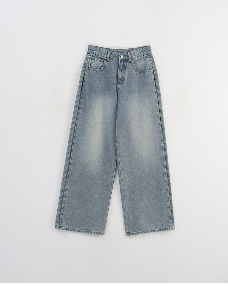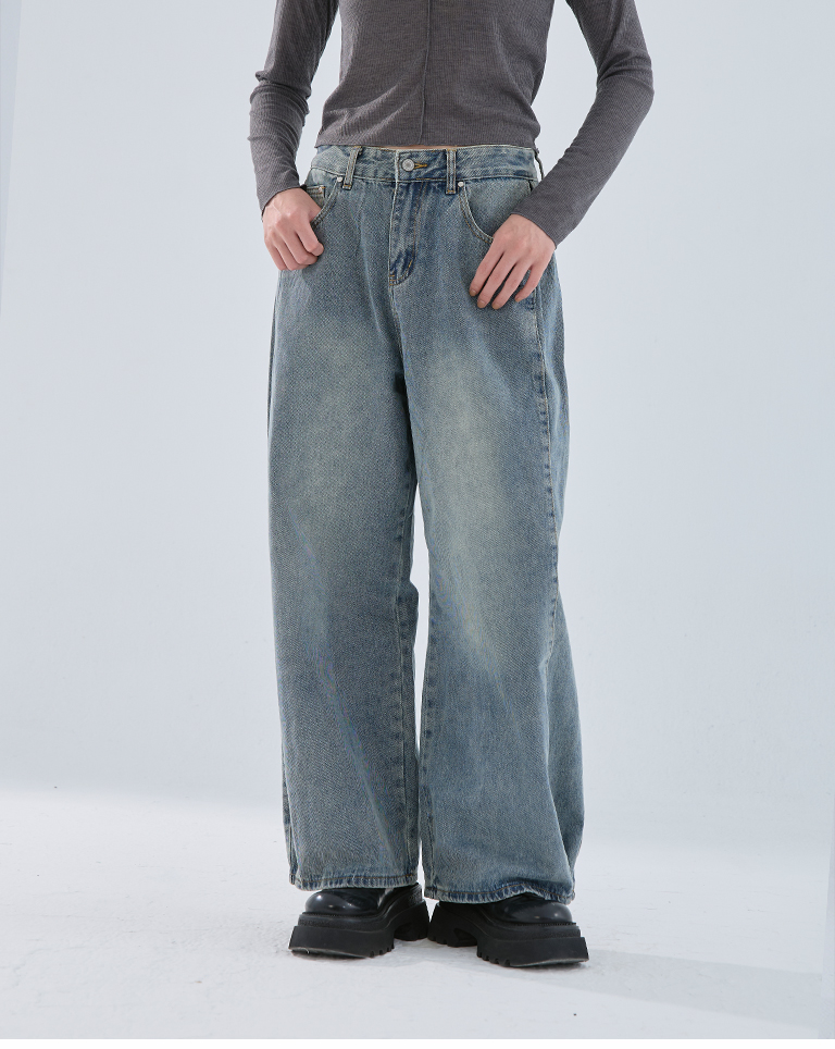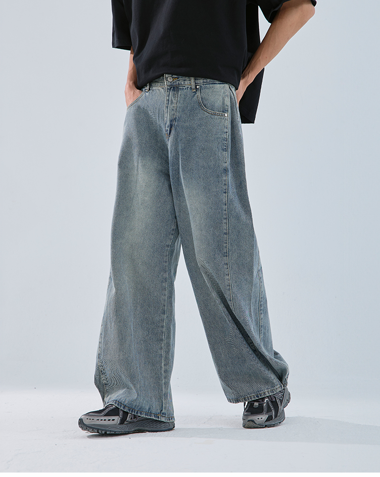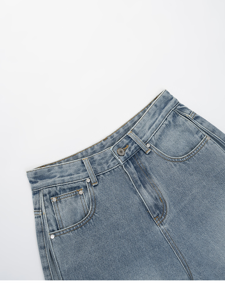 中性打褶金屬釦牛仔褲
