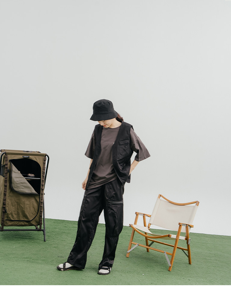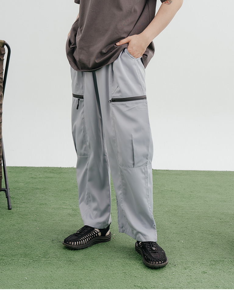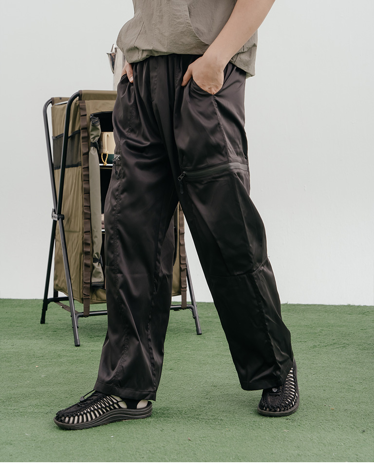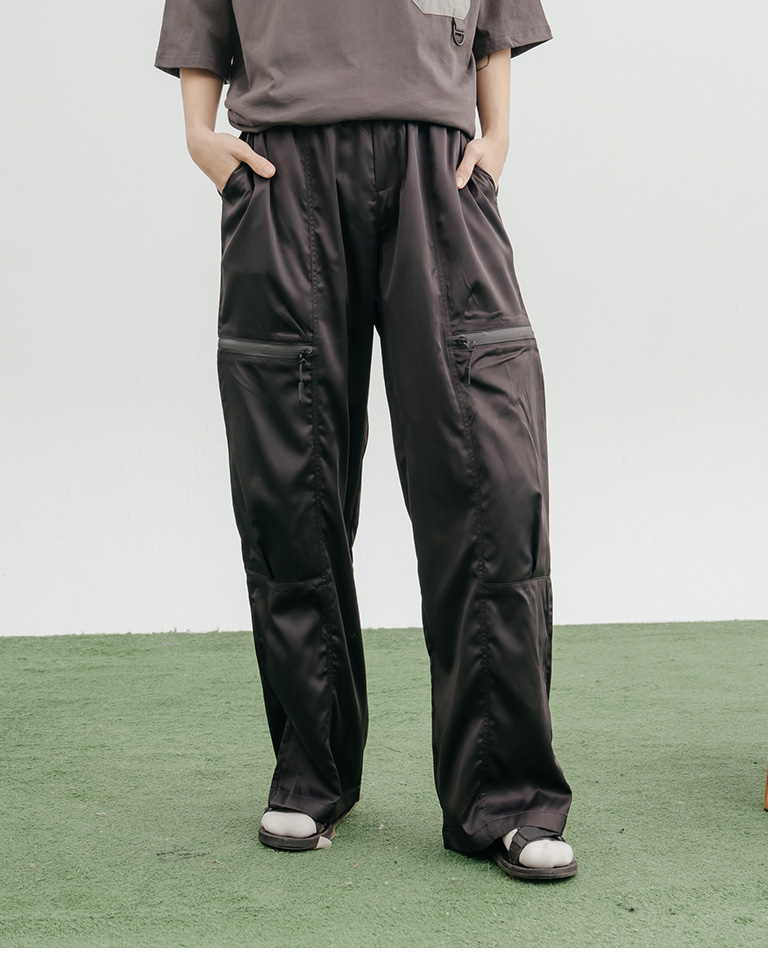 光澤側拉鍊口袋打褶剪接長褲 兩色售 1/2/3