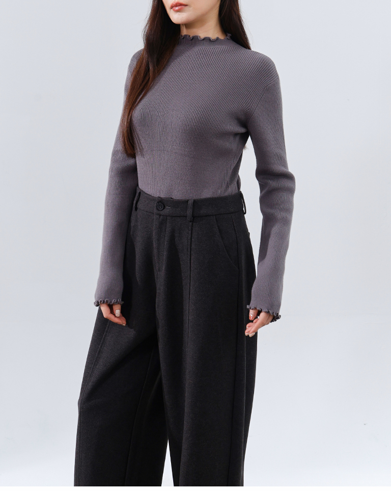S~L身形實測!分尺寸皺皺木耳邊透膚高領長袖上衣