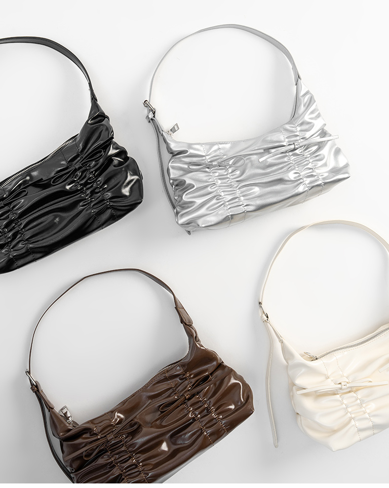 抓皺蝴蝶結皮革肩背包附背帶 四色售