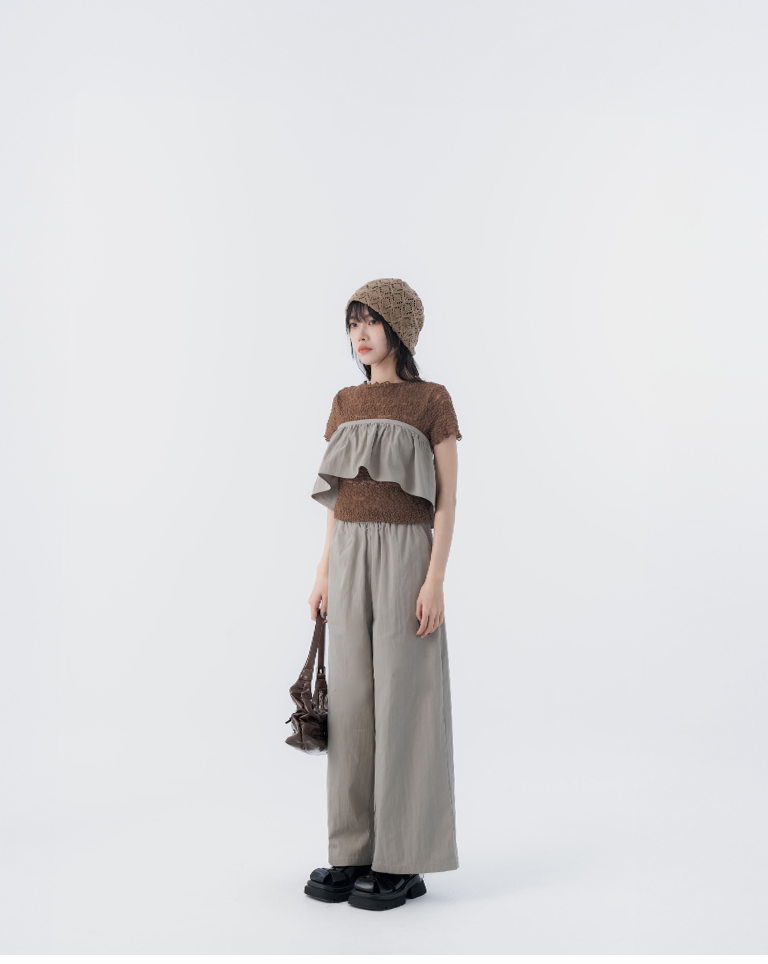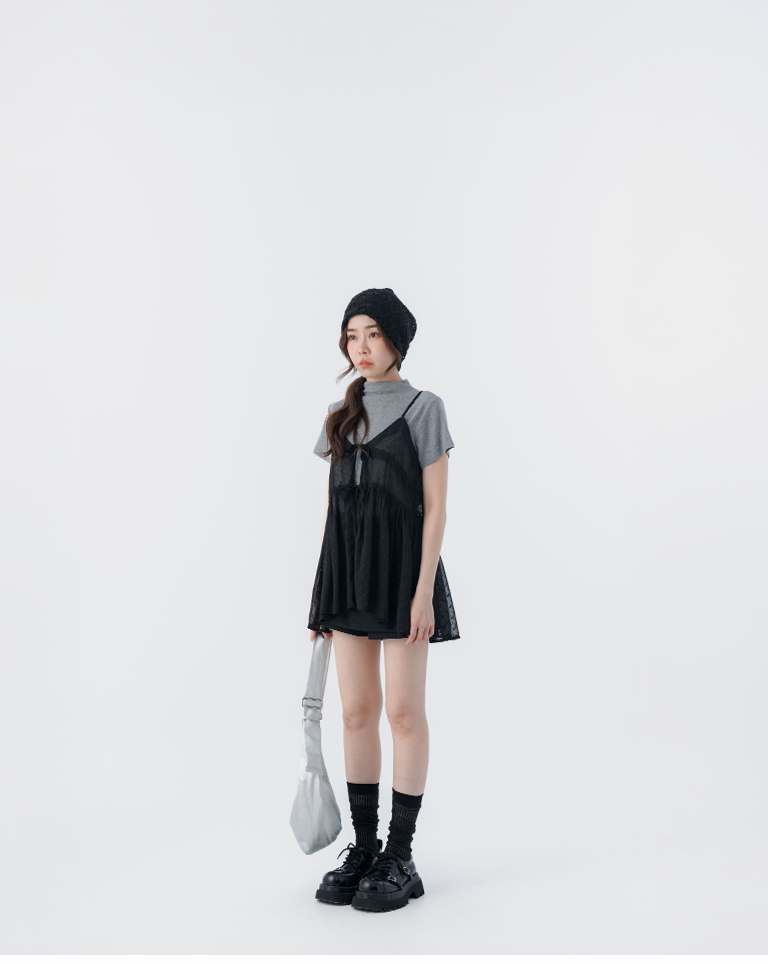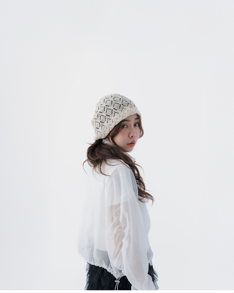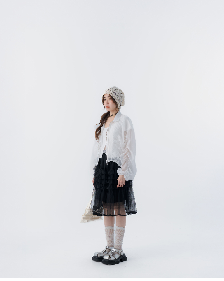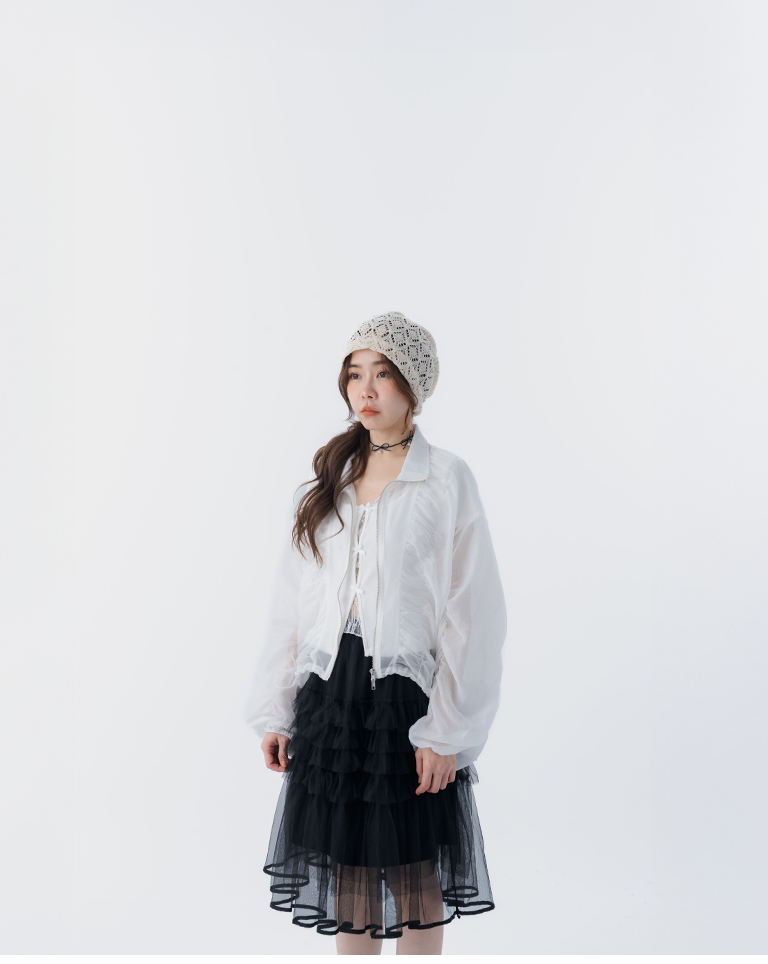 S~L身形實測!分尺寸皺皺木耳邊透膚高領長袖上衣