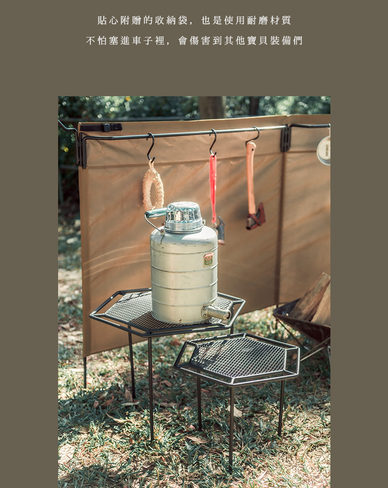 鐵桌邊緣的設計可吊掛鋼杯或其他小物