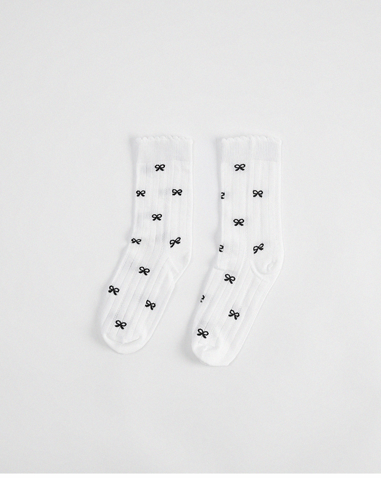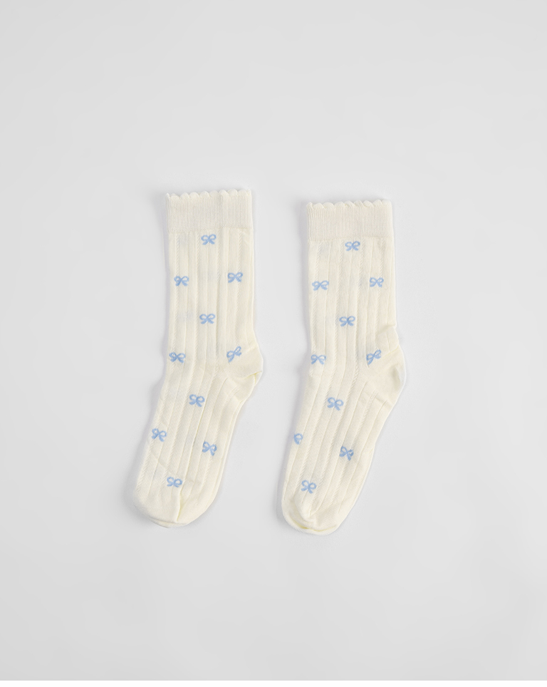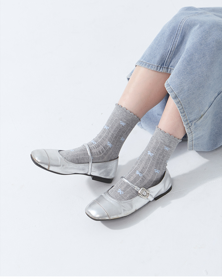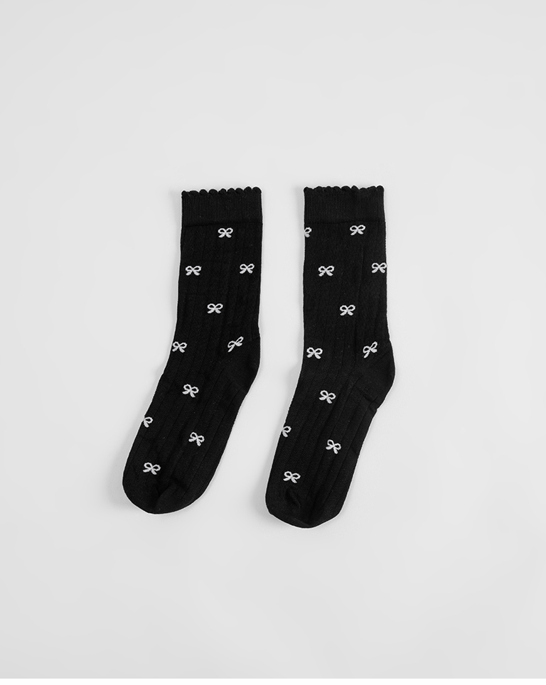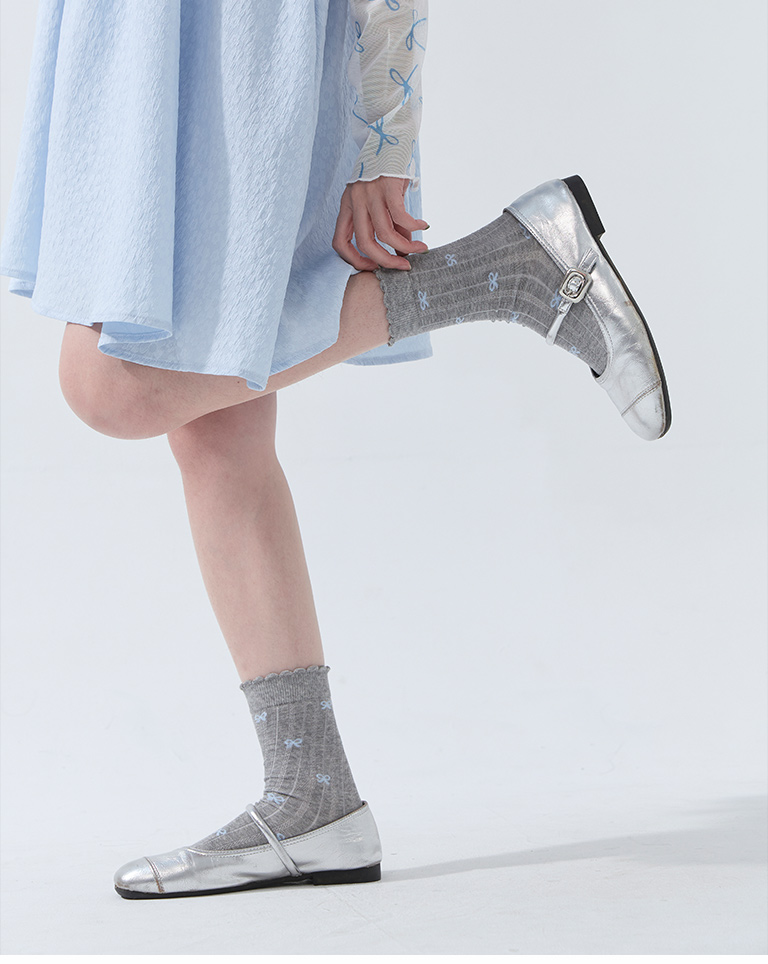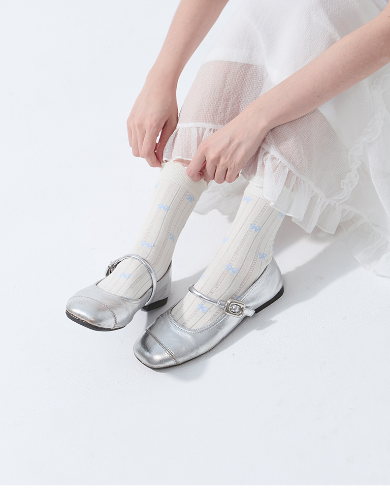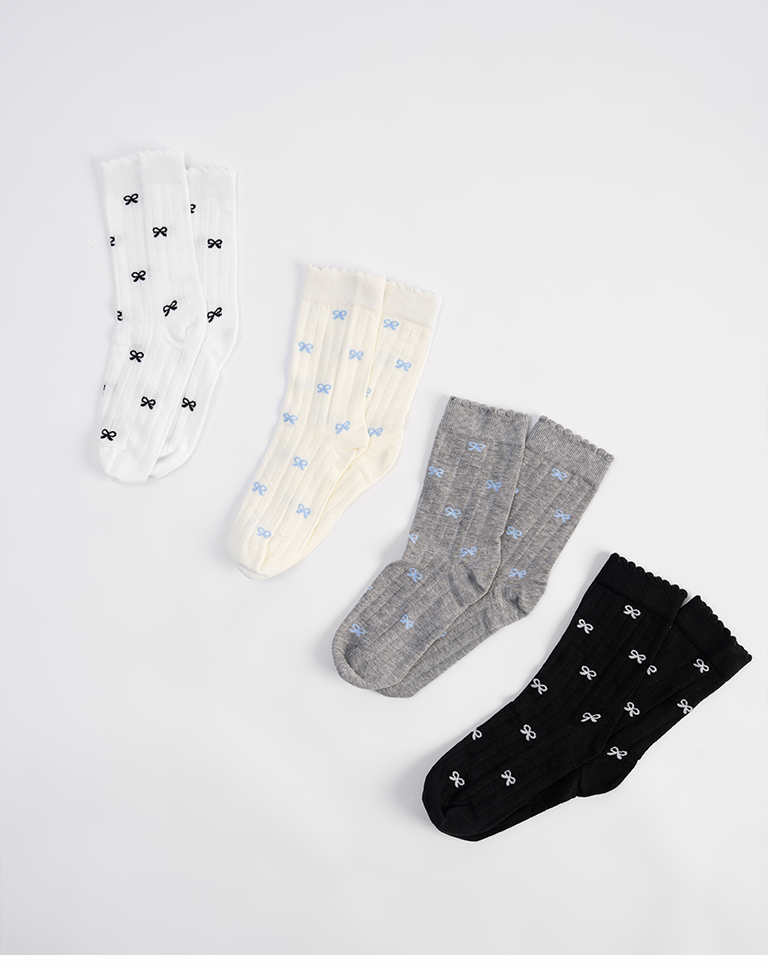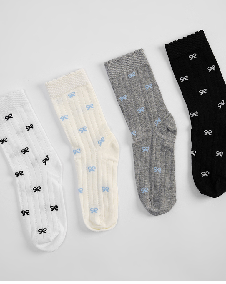 蝴蝶結鏤空直紋花邊中筒襪 四色售 特價
