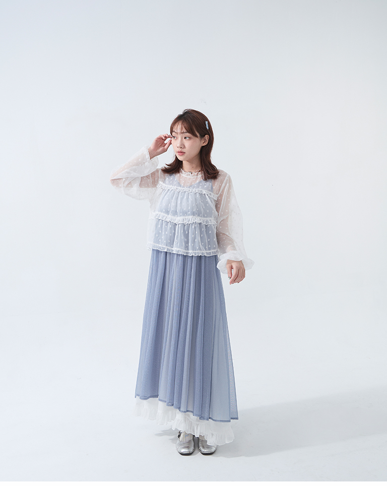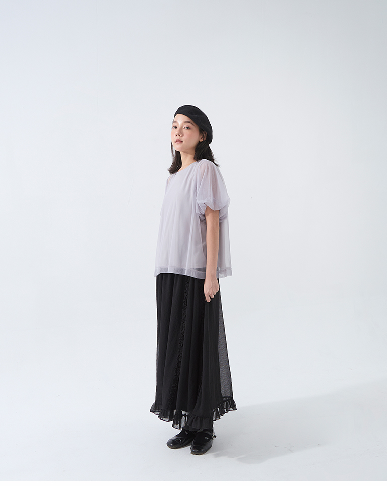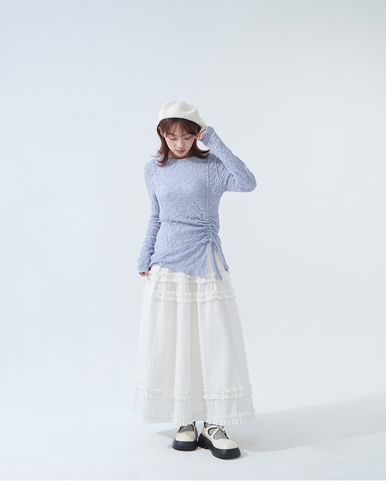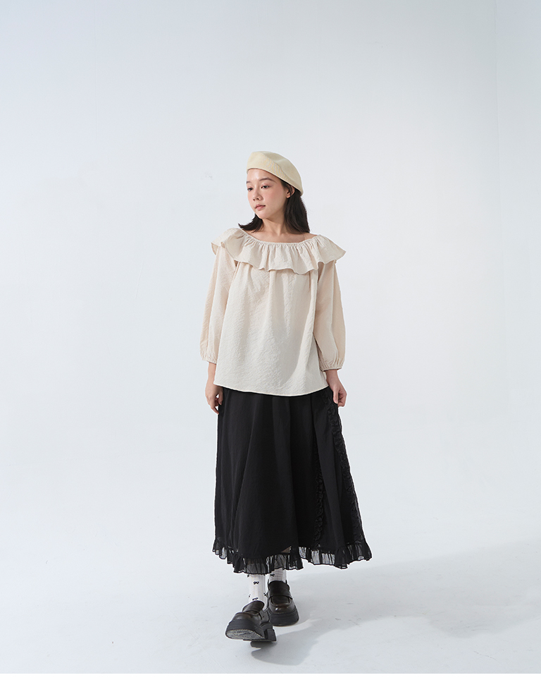 S~L身形實測!分尺寸皺皺木耳邊透膚高領長袖上衣