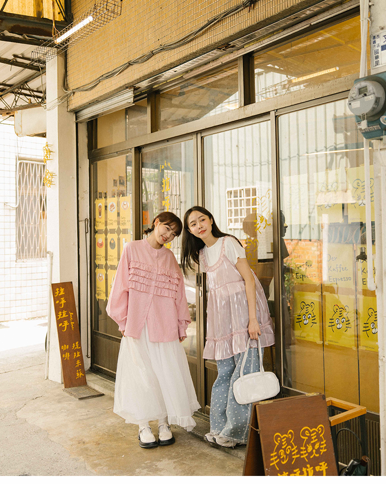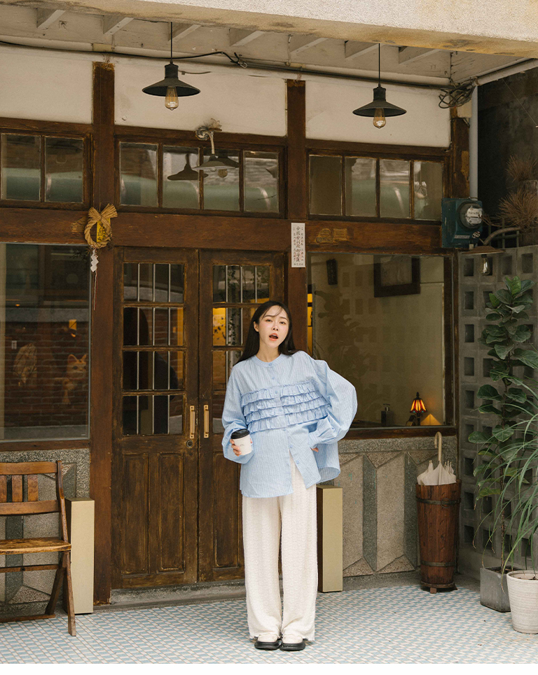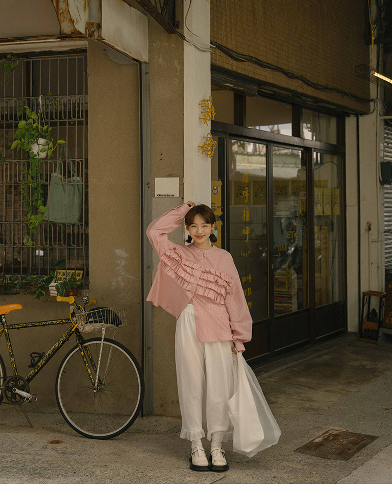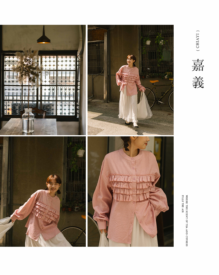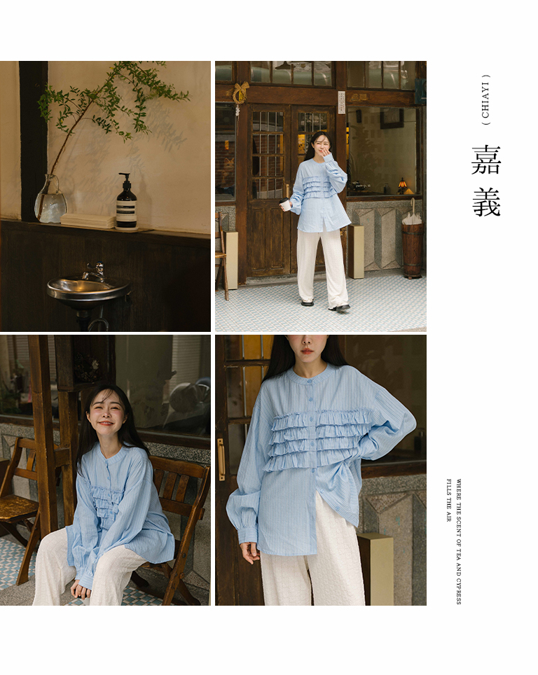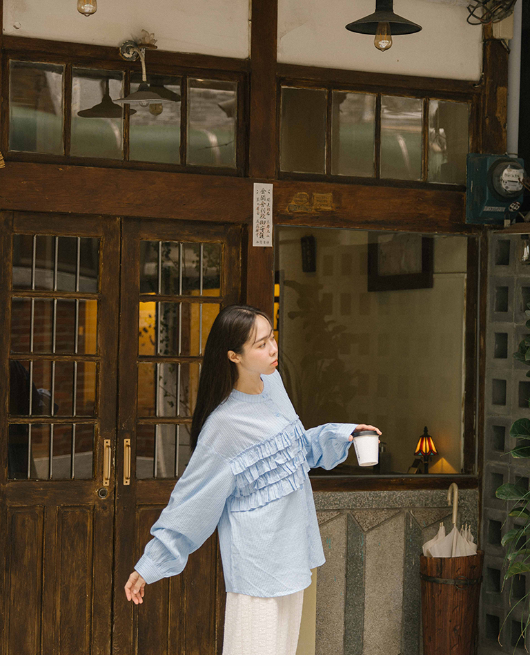 S~L身形實測!分尺寸皺皺木耳邊透膚高領長袖上衣