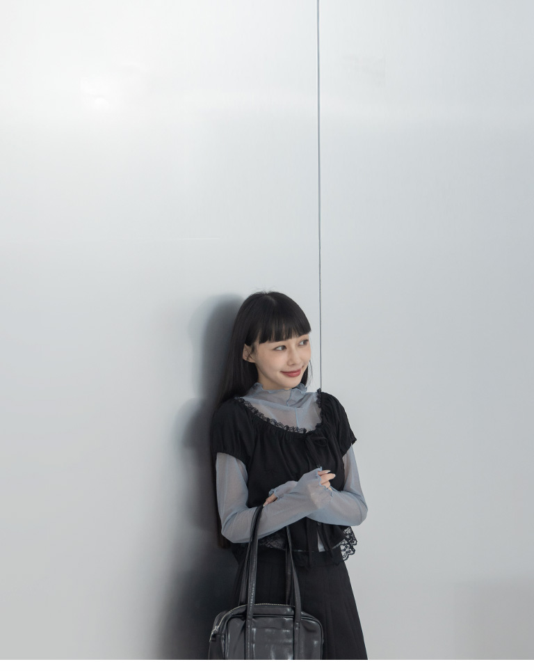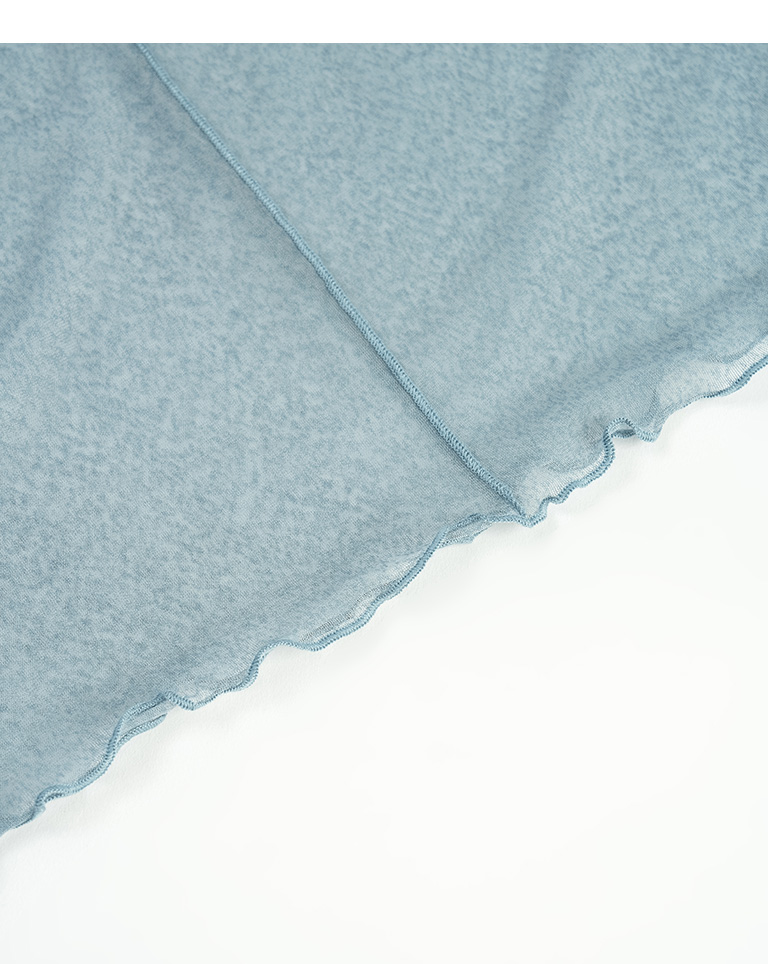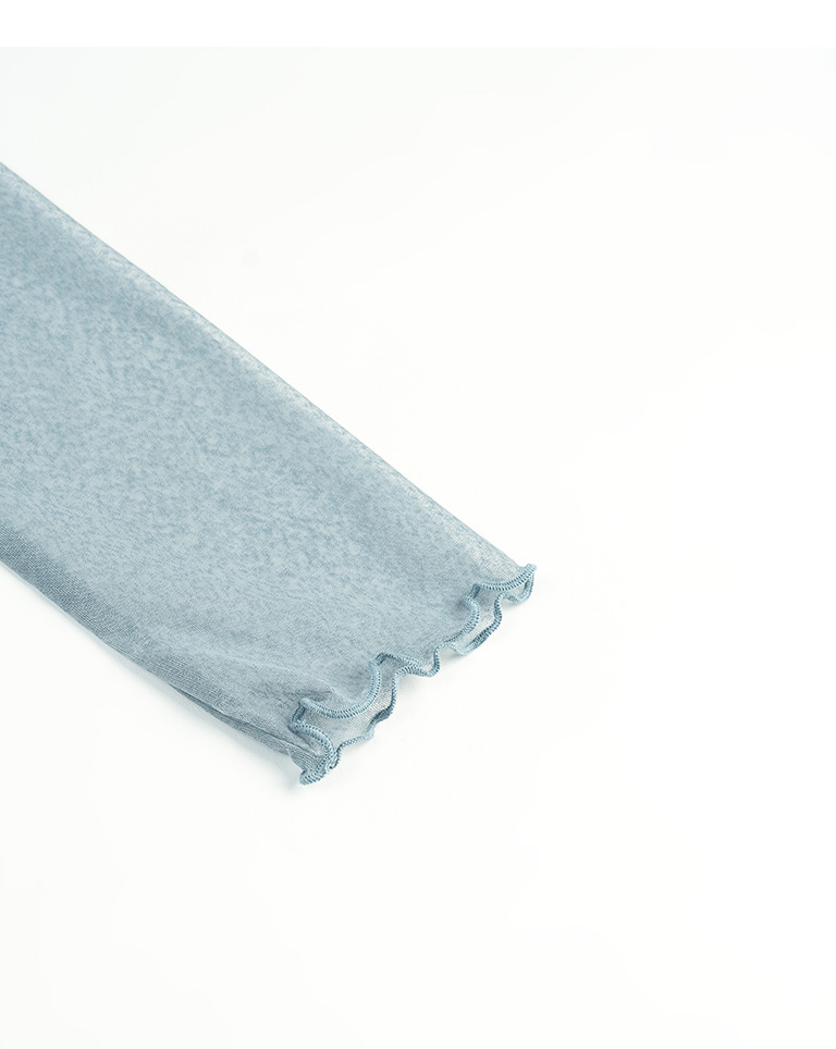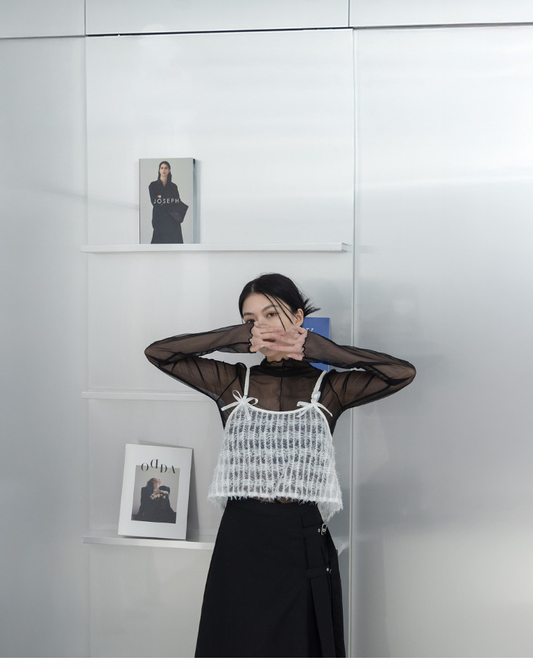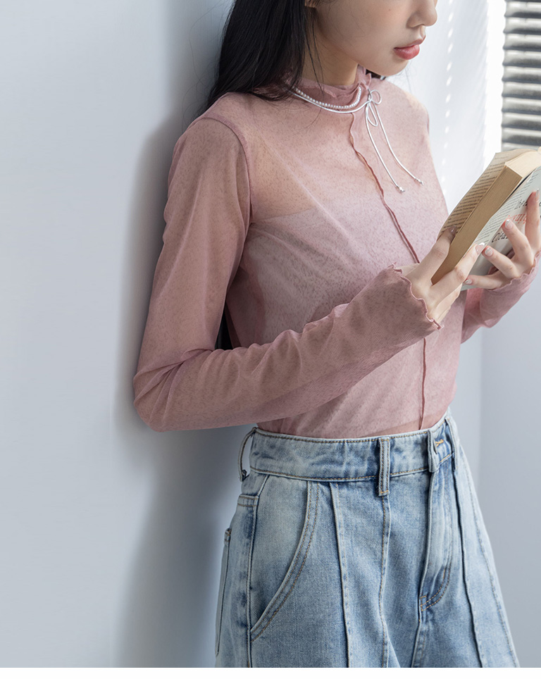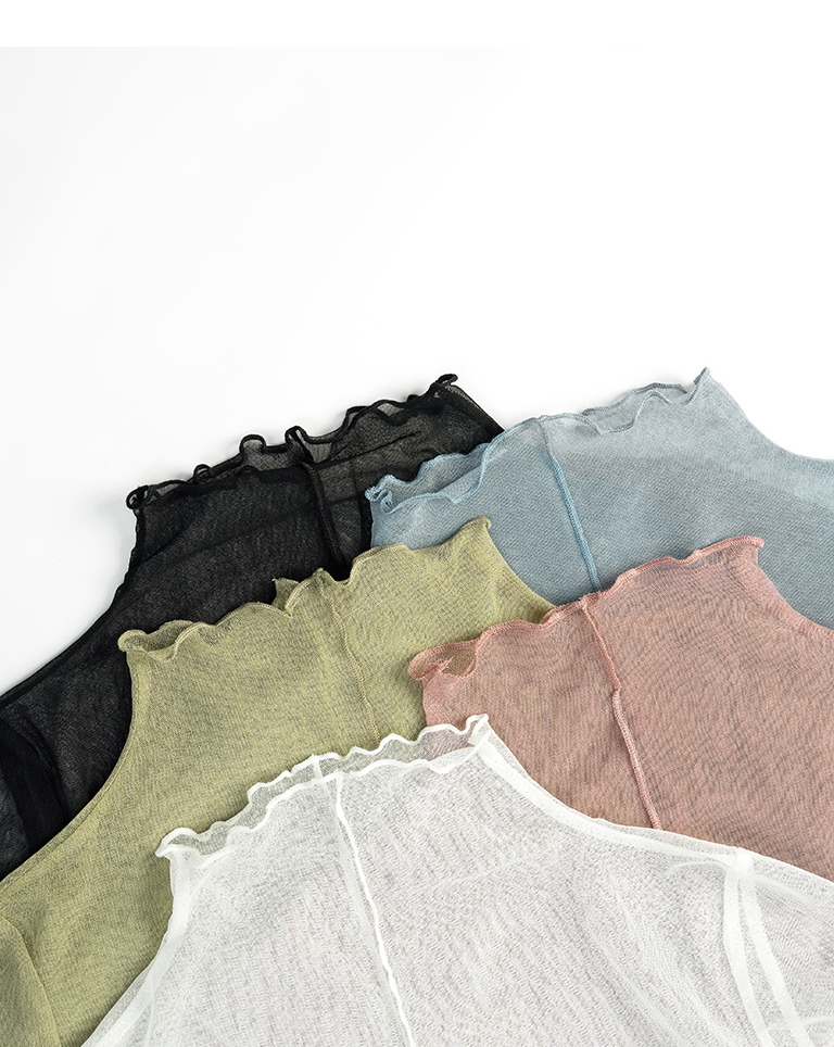 S~L身形實測!分尺寸皺皺木耳邊透膚高領長袖上衣