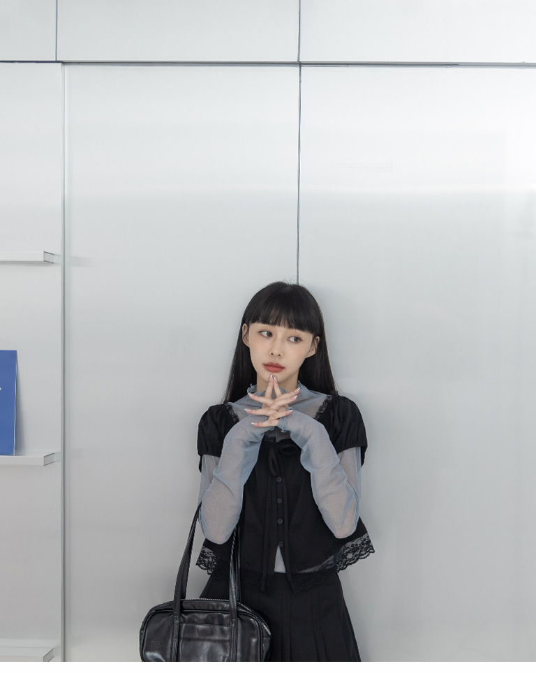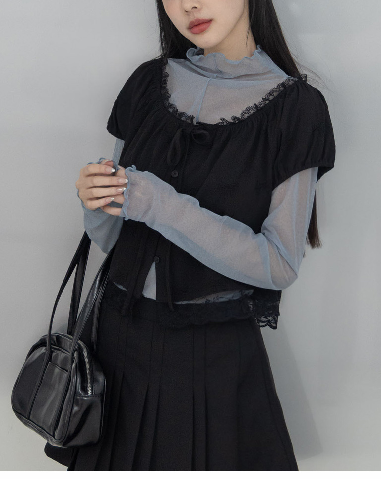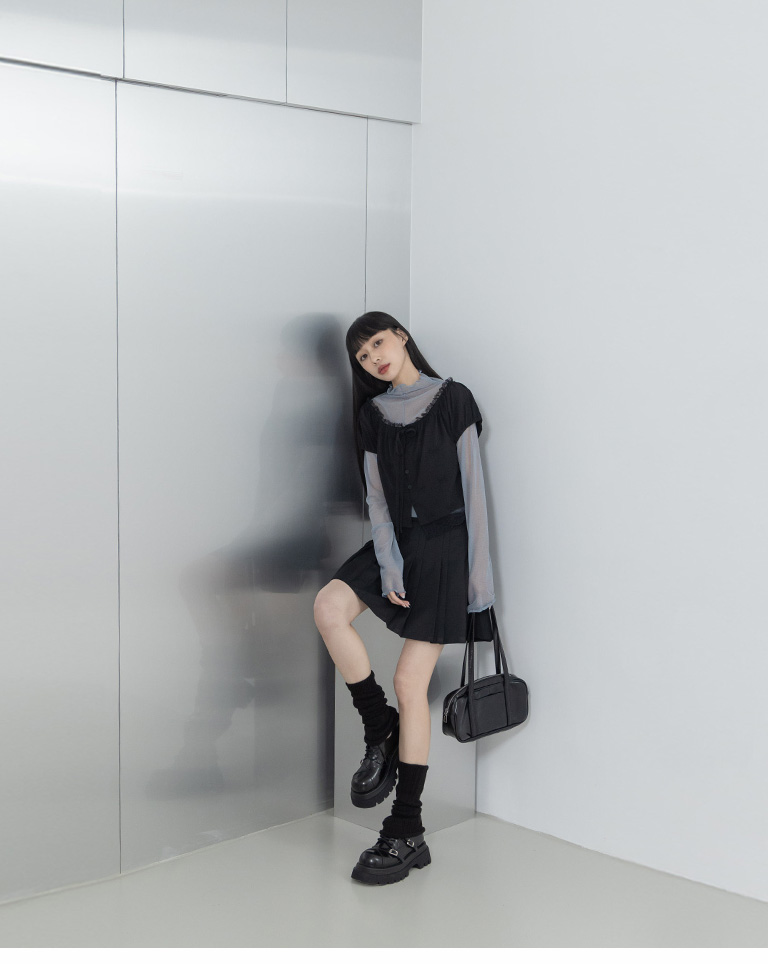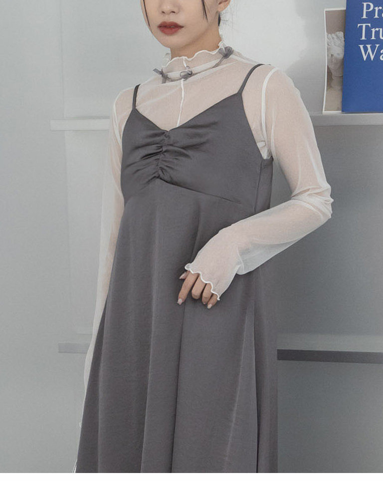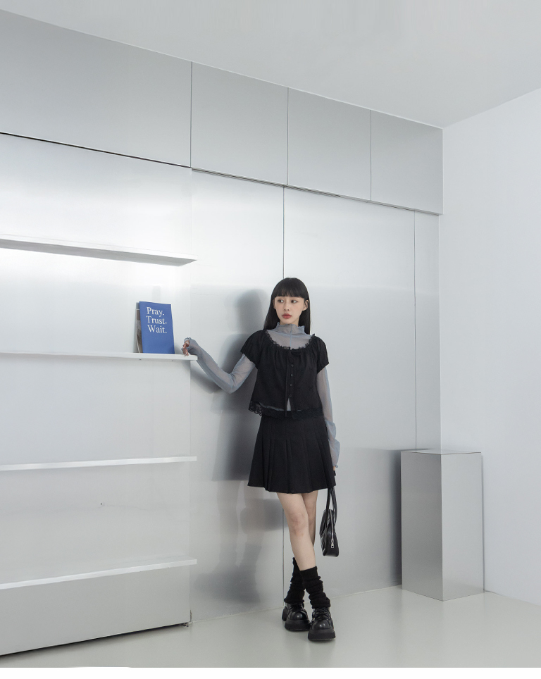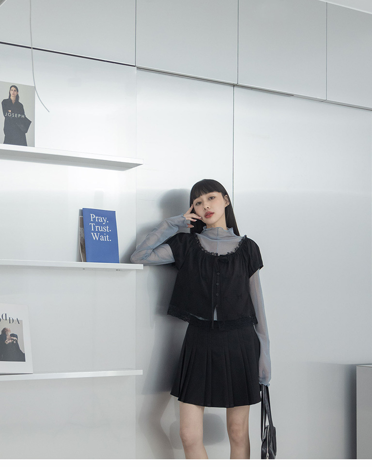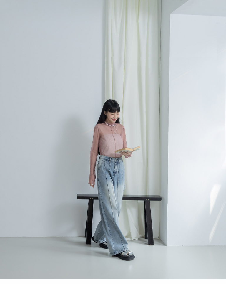 S~L身形實測!分尺寸皺皺木耳邊透膚高領長袖上衣