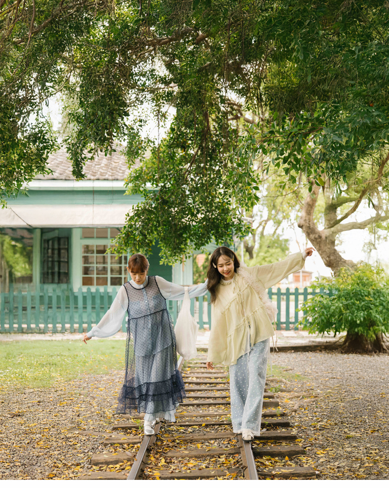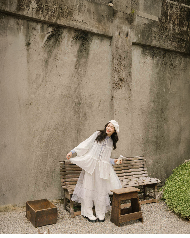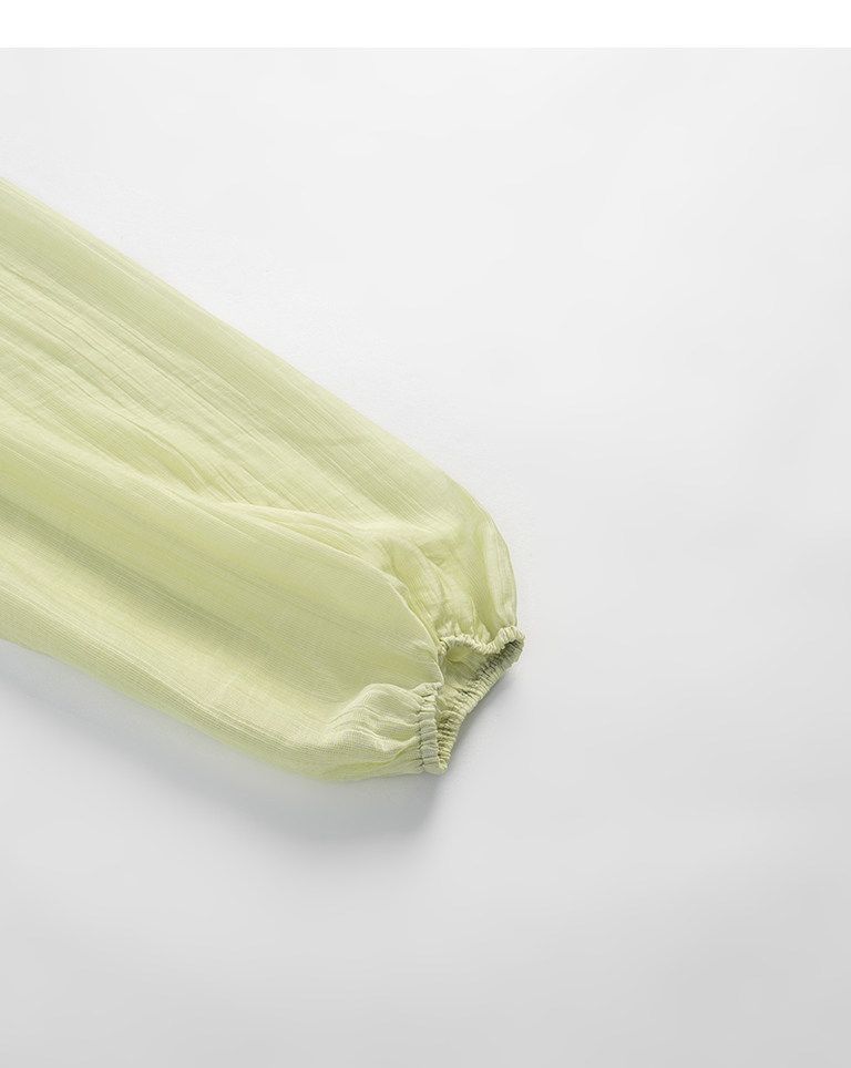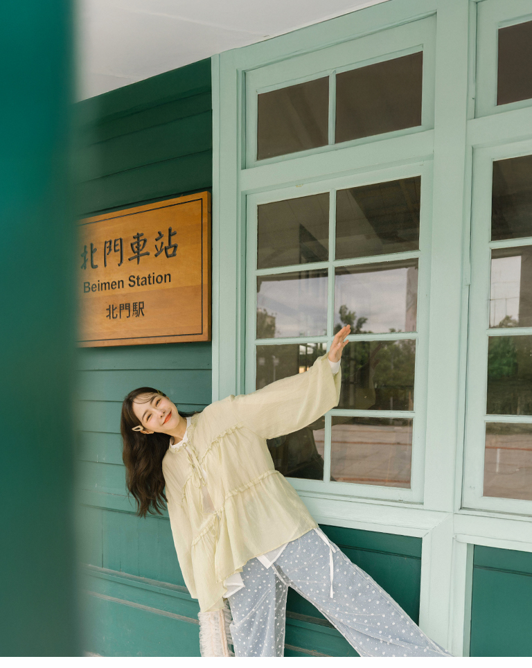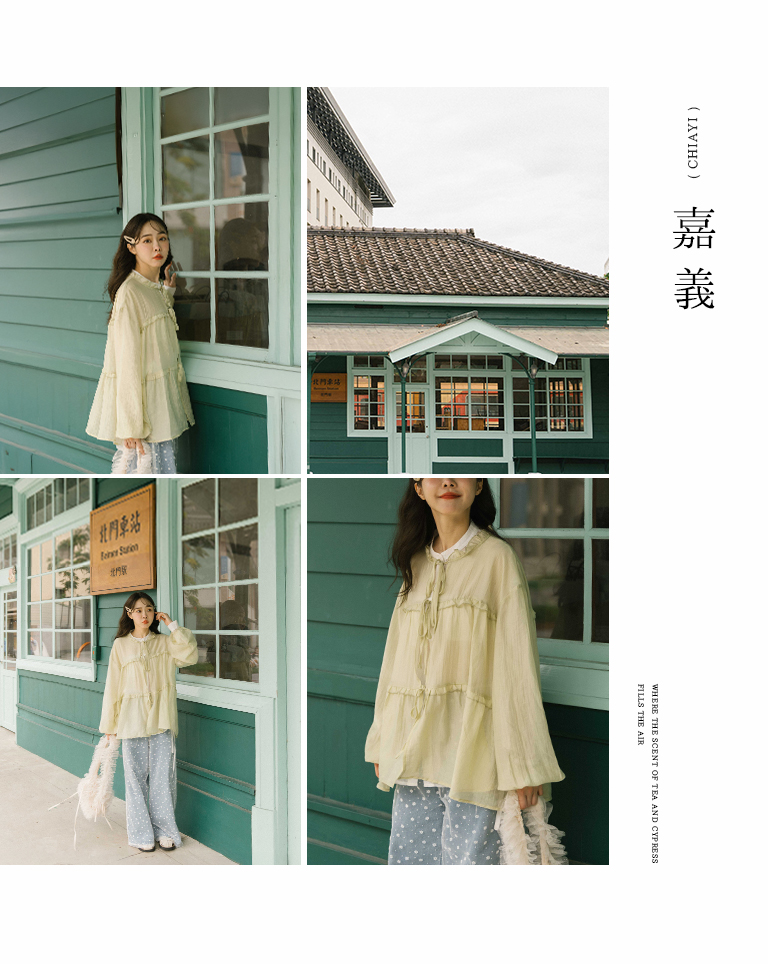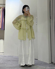 荷葉領澎袖綁帶透紗罩衫 兩色售