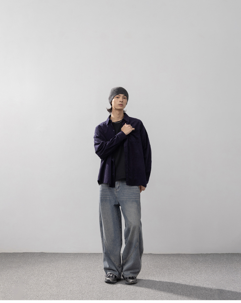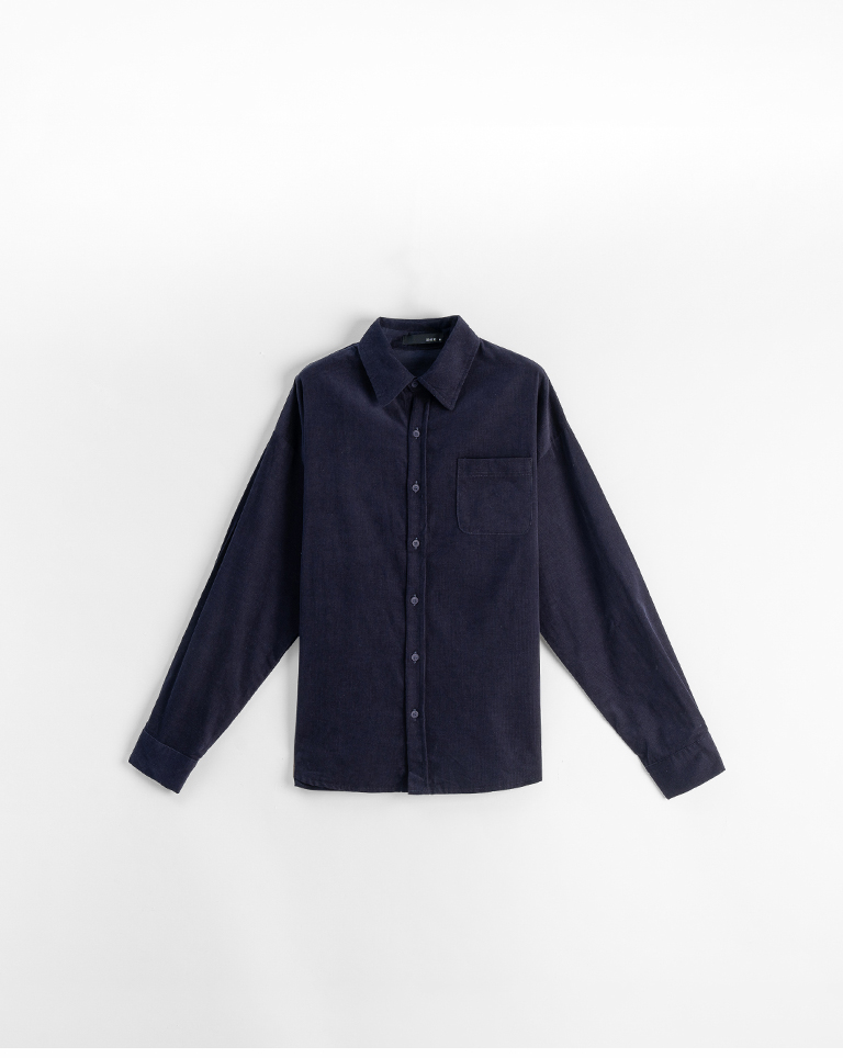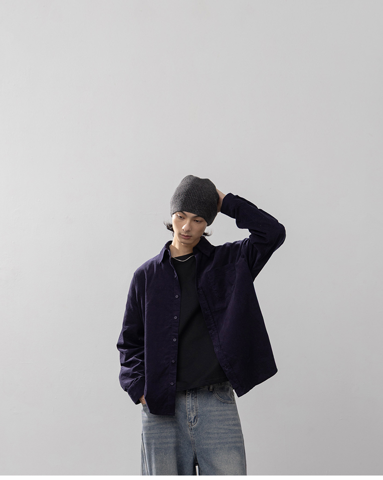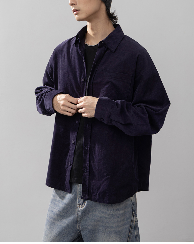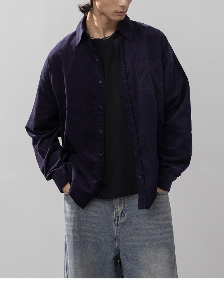 男裝 質感燈芯絨單口袋寬版襯衫-深藍 S-XL