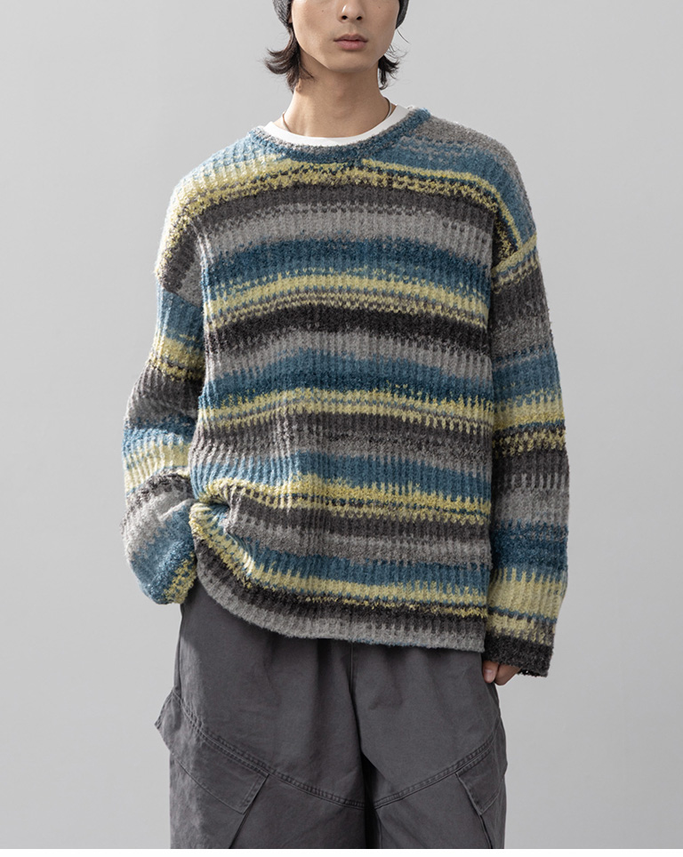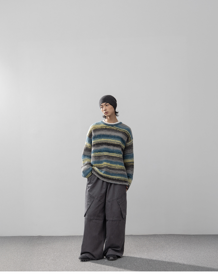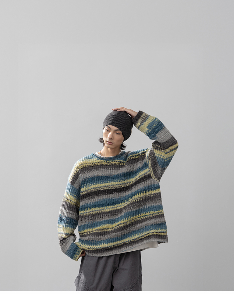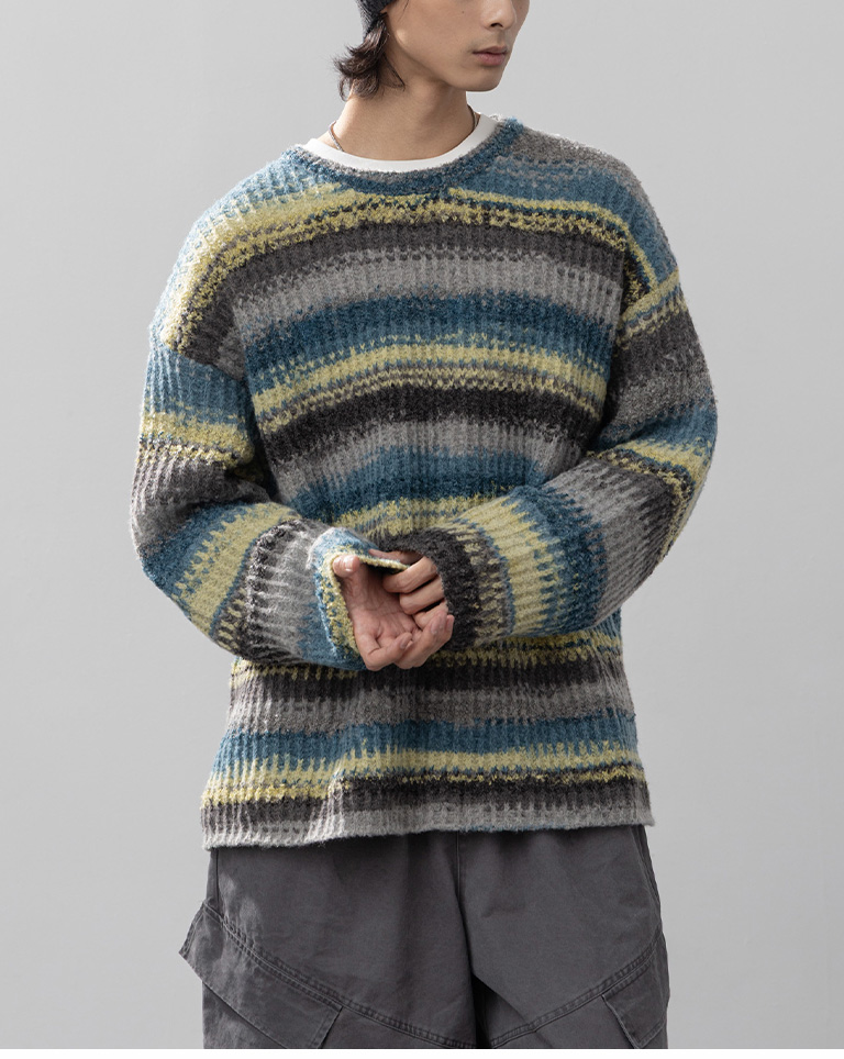 男裝 配色條紋休閒針織毛衣-灰綠 M/L