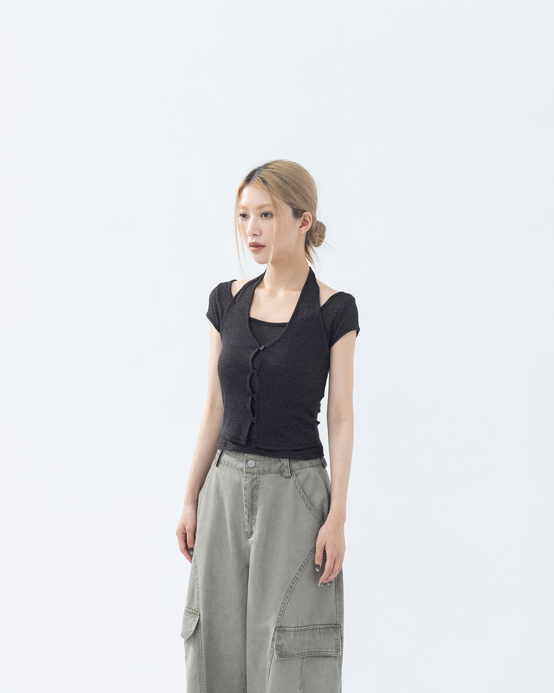 假兩件繞脖背心設計短袖上衣 兩色售S/M