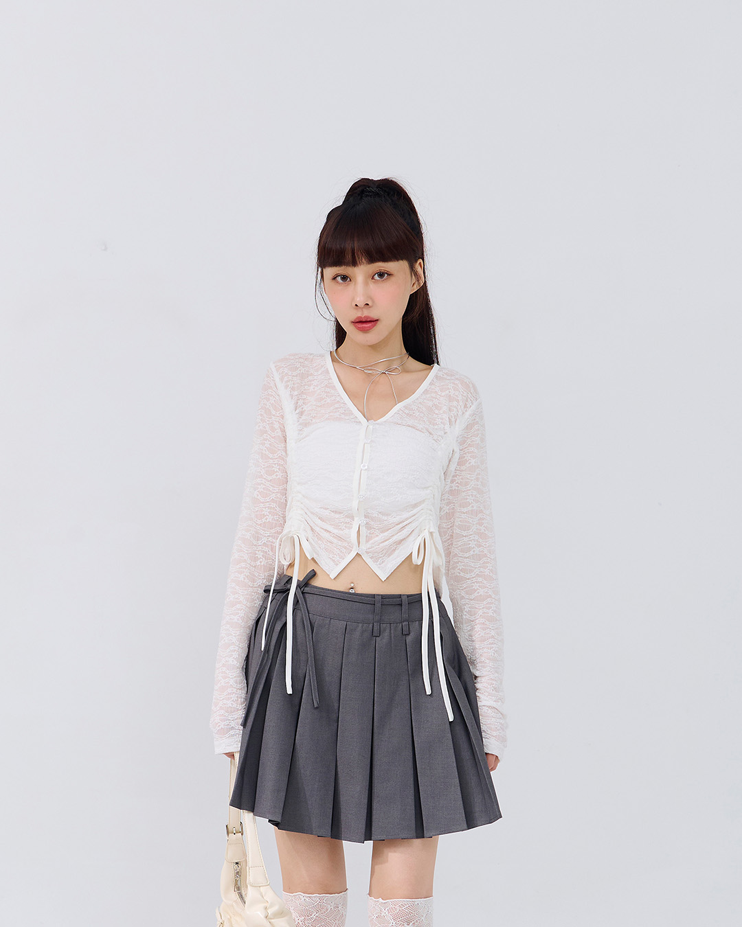 側抽繩綁帶設計透膚短版襯衫 三色售