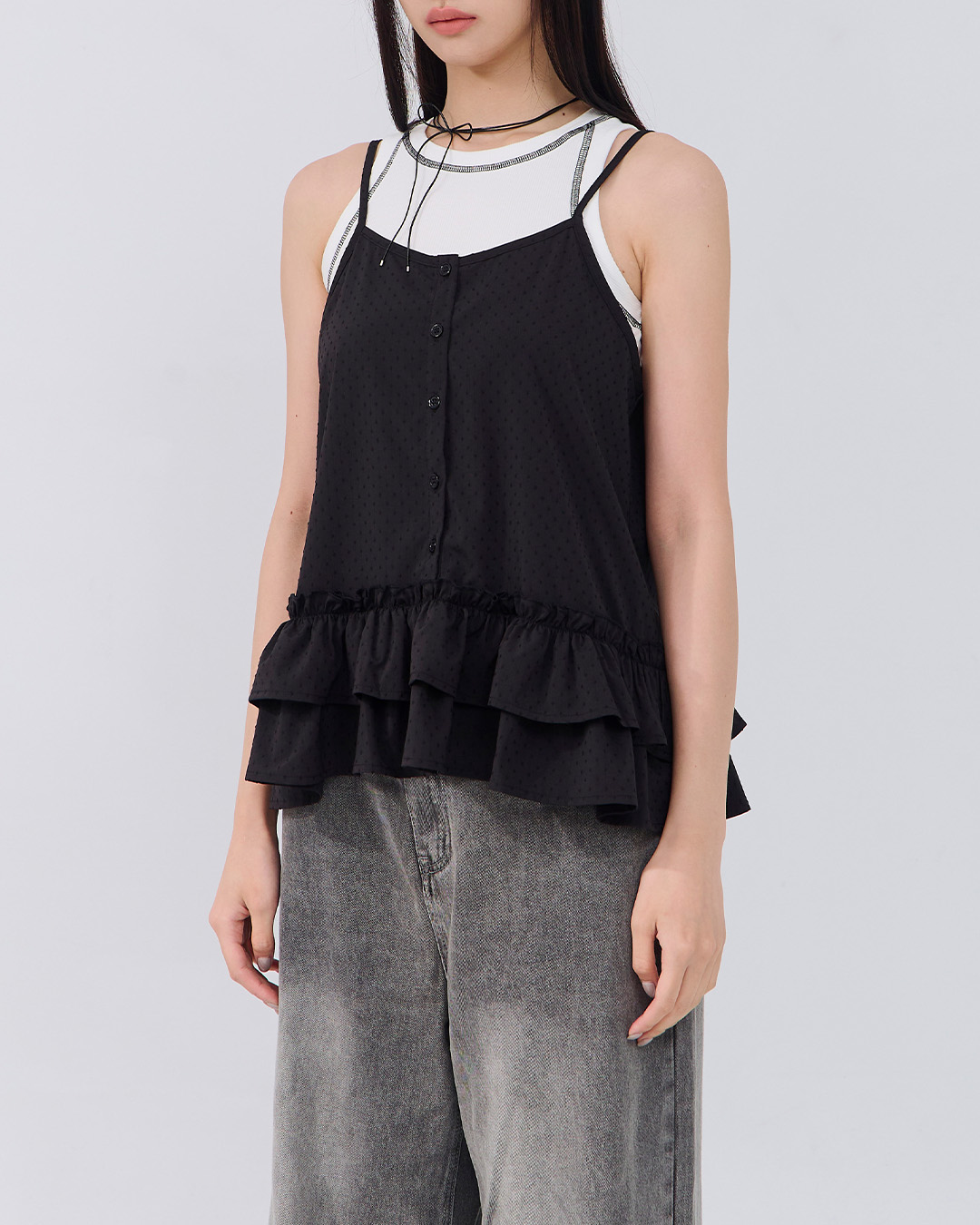 立體點點下襬荷葉細肩背心 三色售