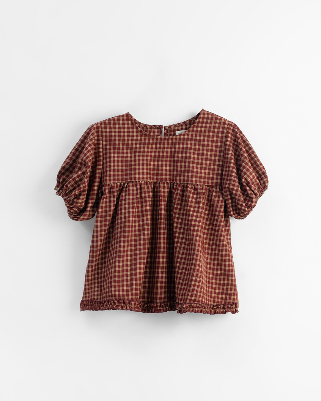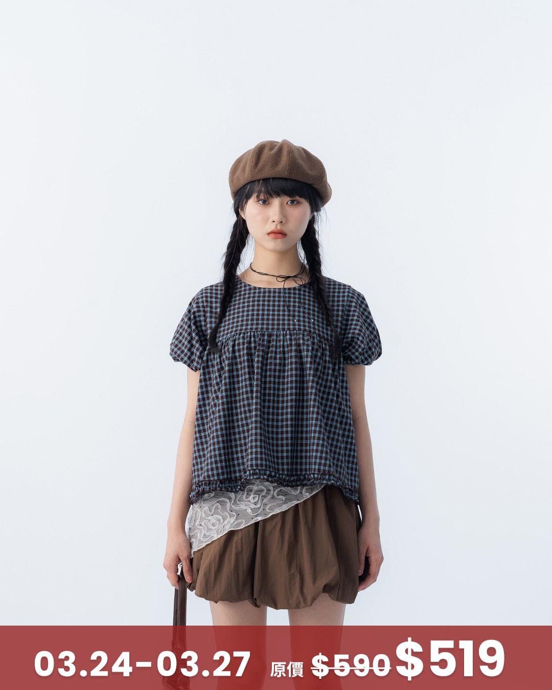 格紋荷葉剪接澎袖傘擺上衣 兩色售