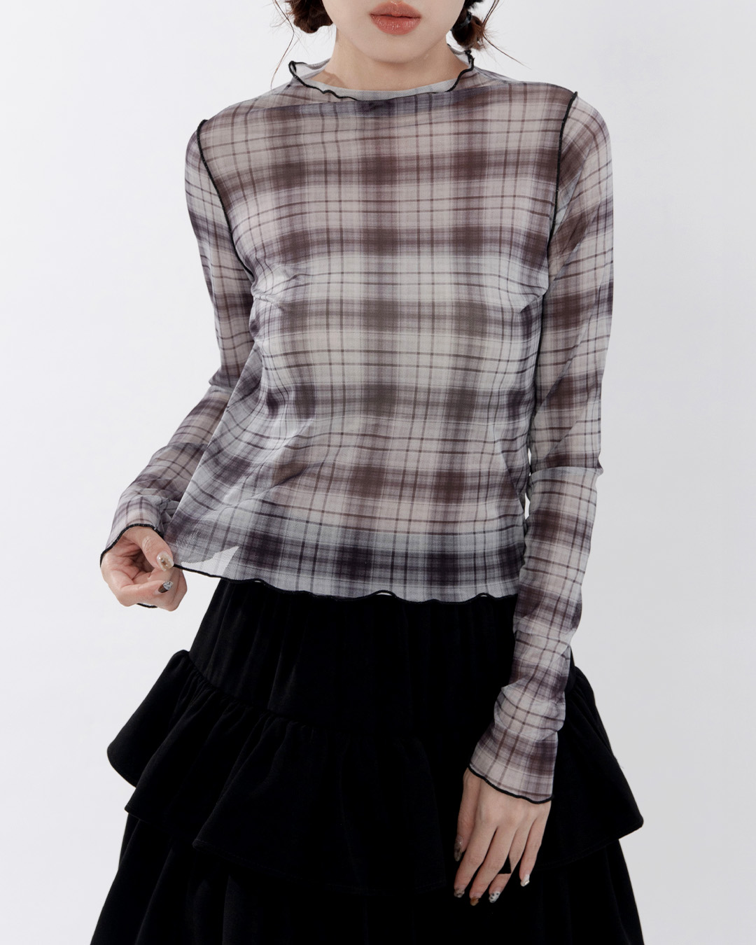 格紋配色木耳邊透膚長袖上衣 S/M