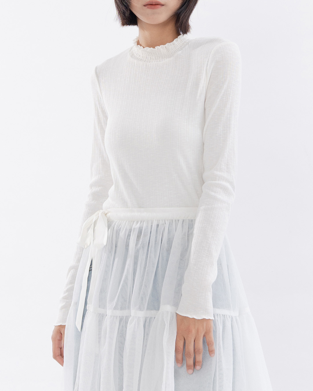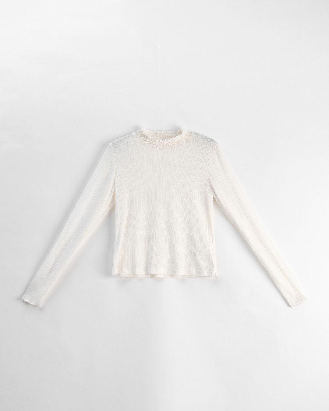 微透膚條紋木耳邊高領長袖上衣-白 S/M/L