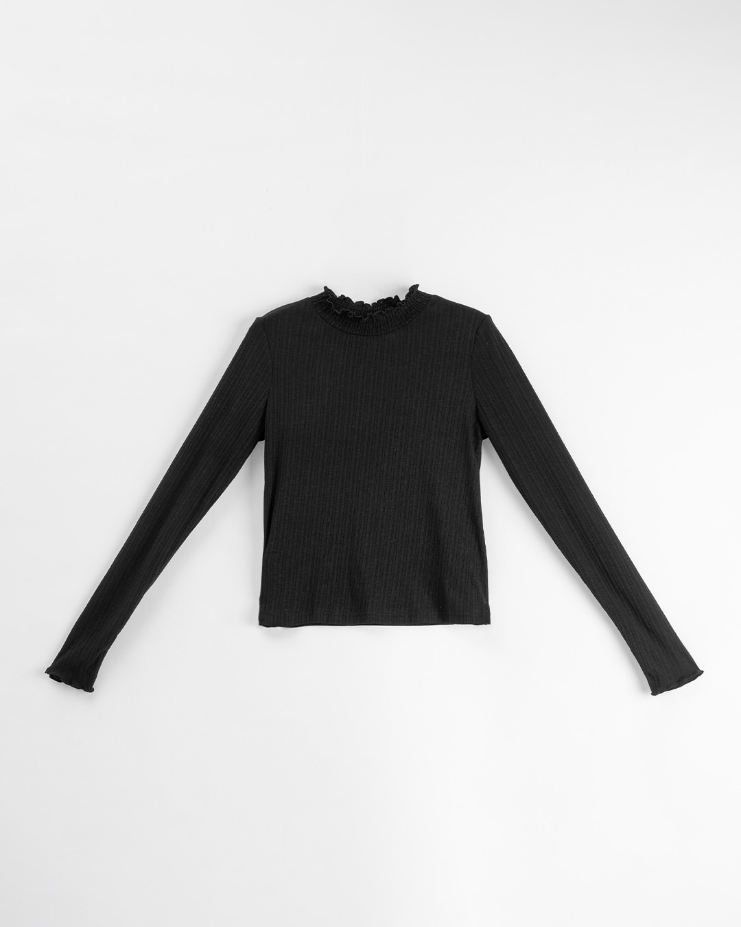 微透膚條紋木耳邊高領長袖上衣-黑 S/M/L