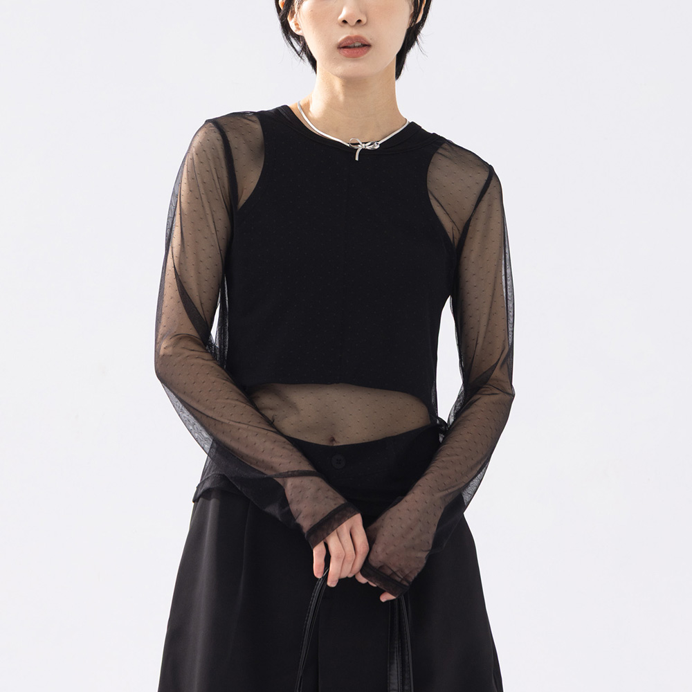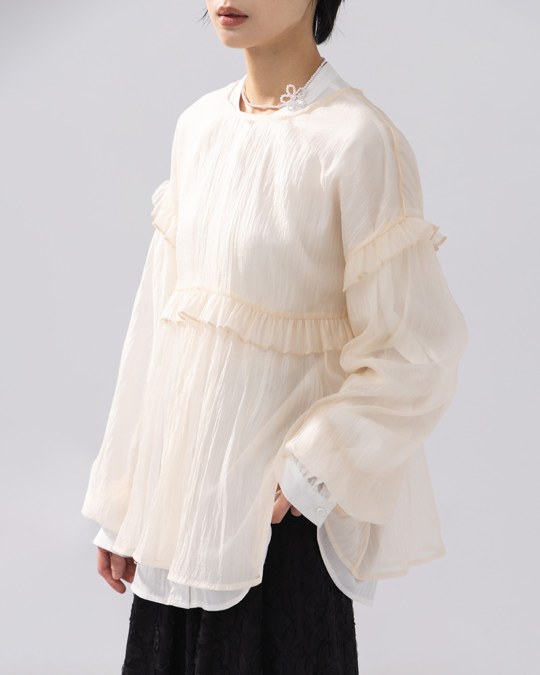 荷葉澎袖傘襬造型透紗上衣 兩色售