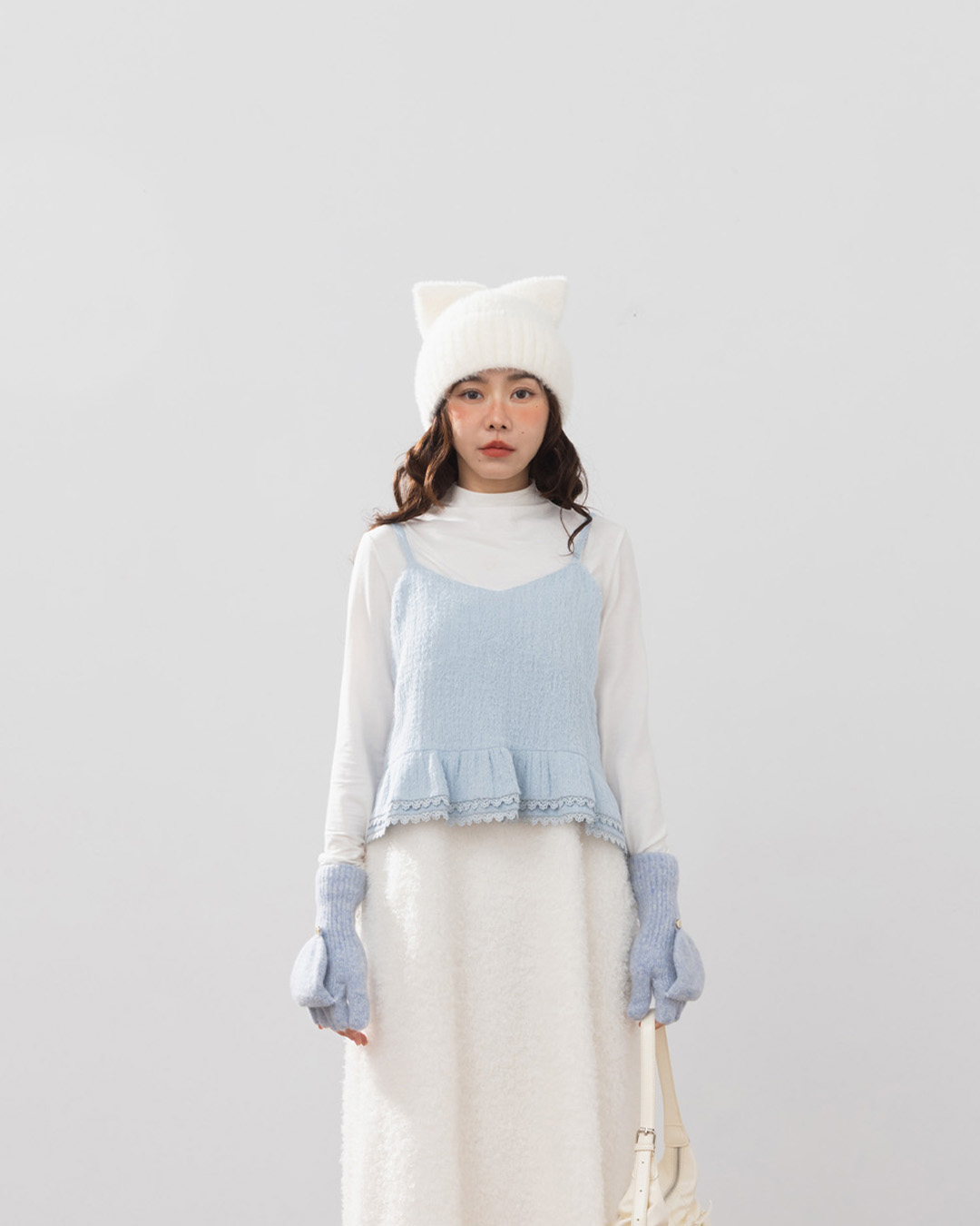 蕾絲下襬毛絨設計細肩罩衫背心-藍