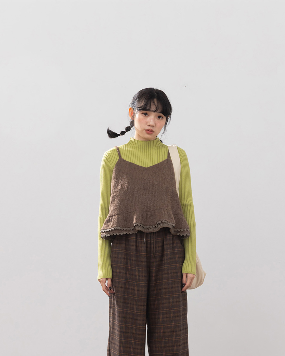蕾絲下襬毛絨設計細肩罩衫背心-咖啡