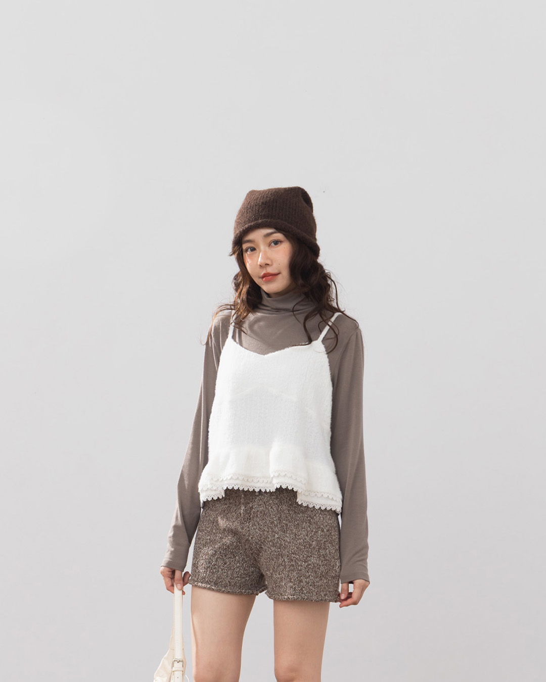 蕾絲下襬毛絨設計細肩罩衫背心-米白