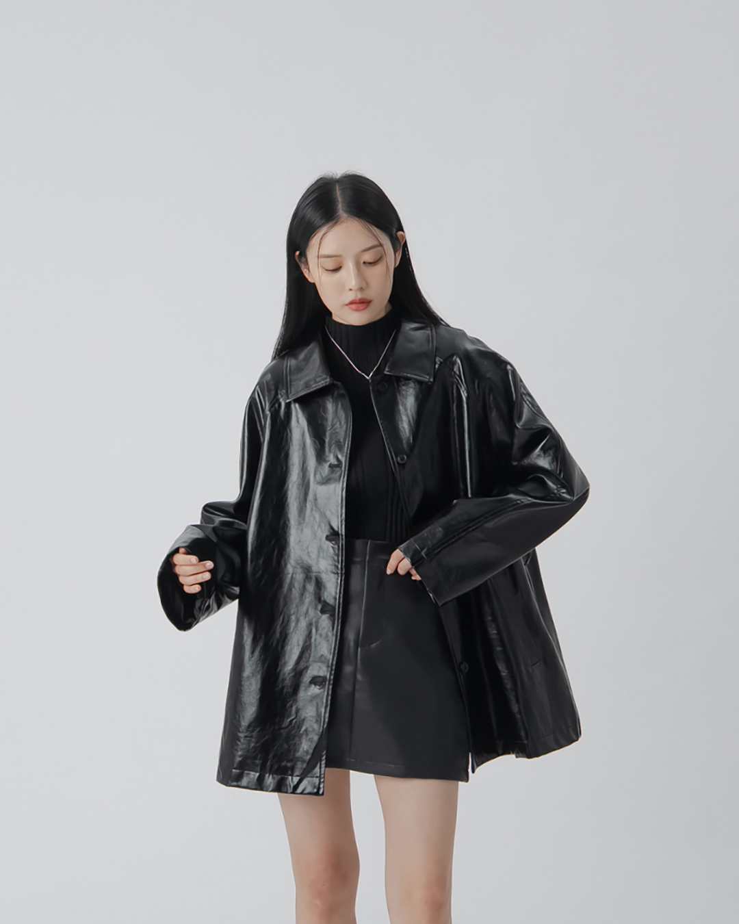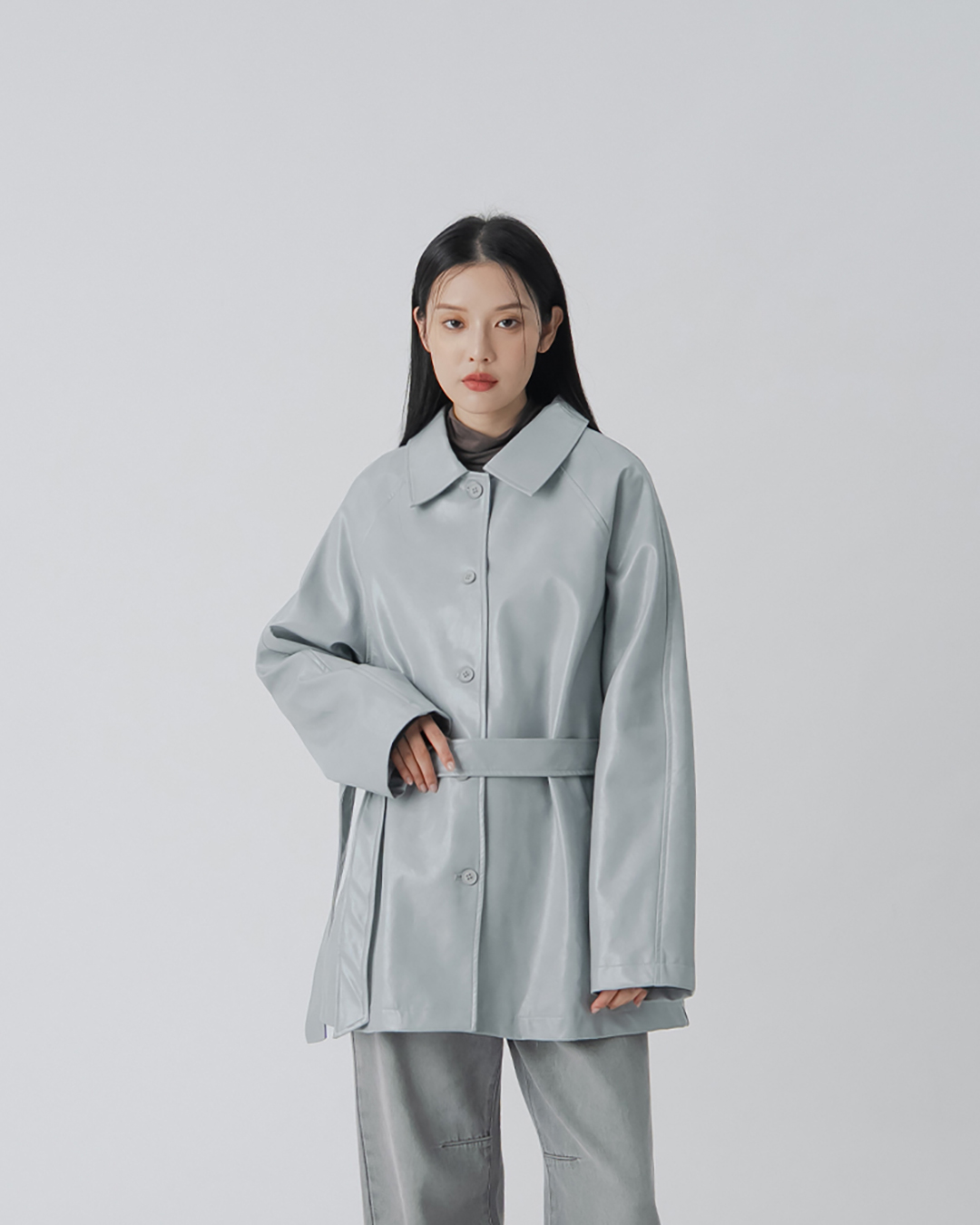 質感光澤皮革大衣外套附綁帶 - 灰藍