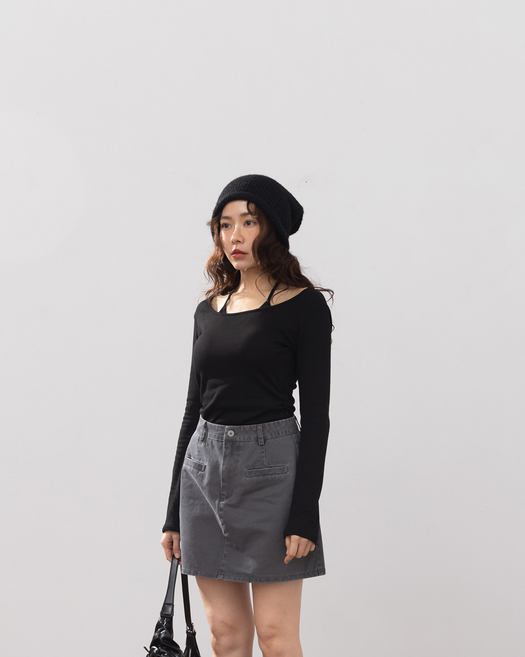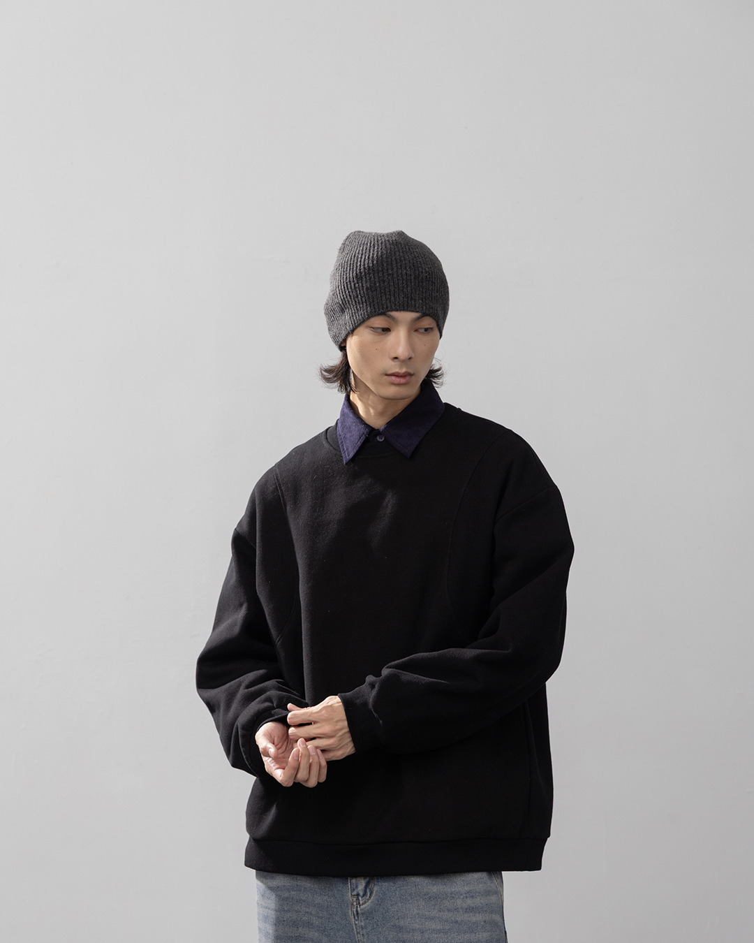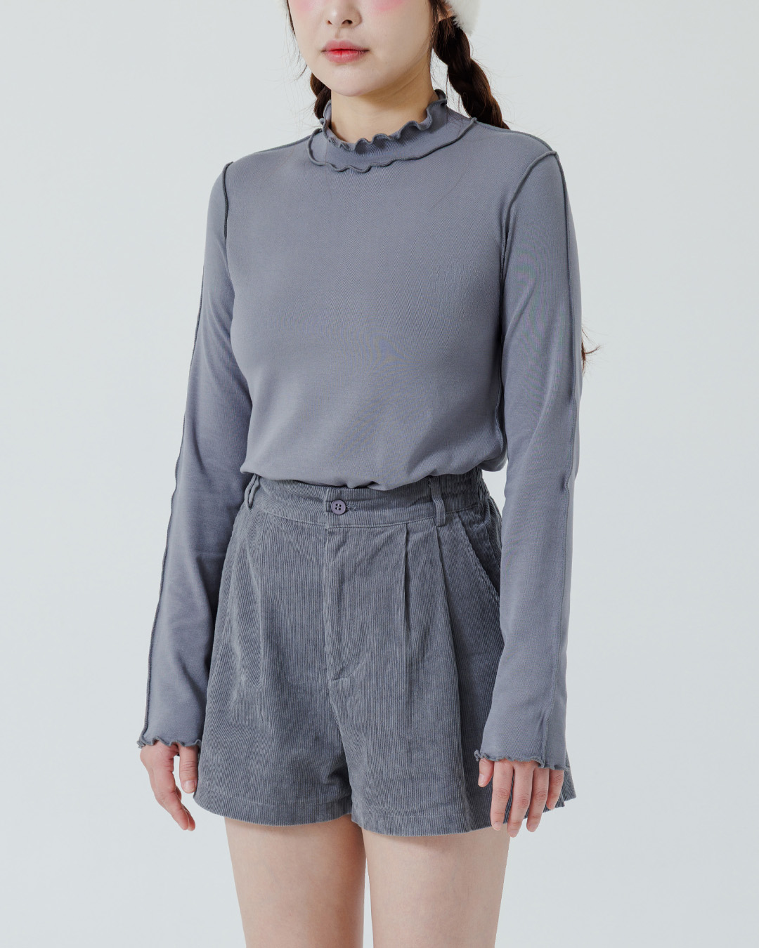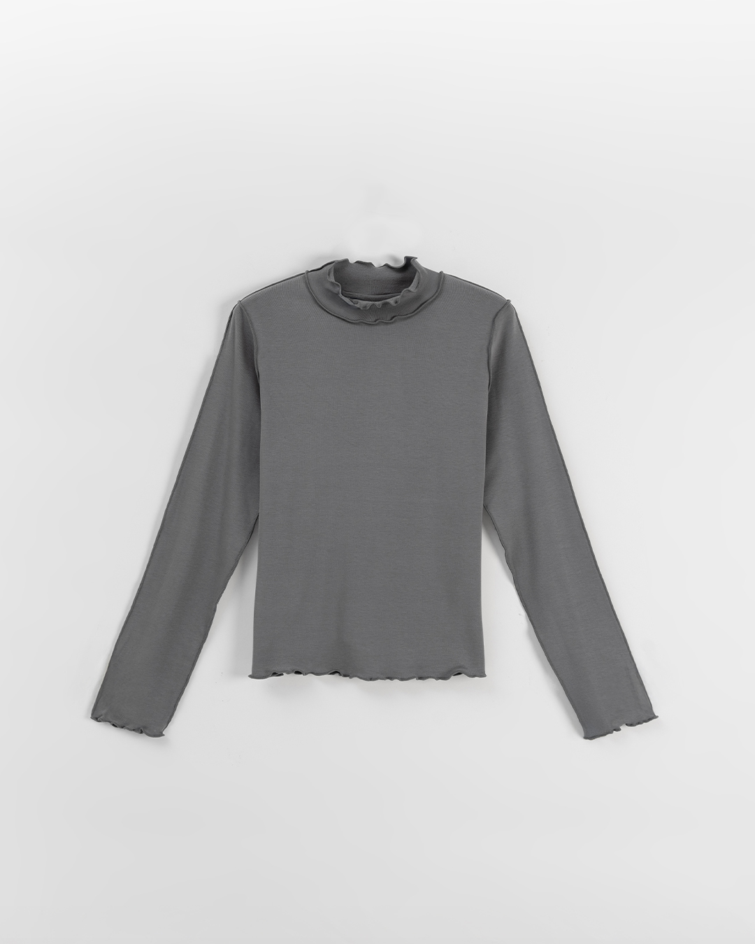 內磨毛木耳邊剪接高領上衣-灰