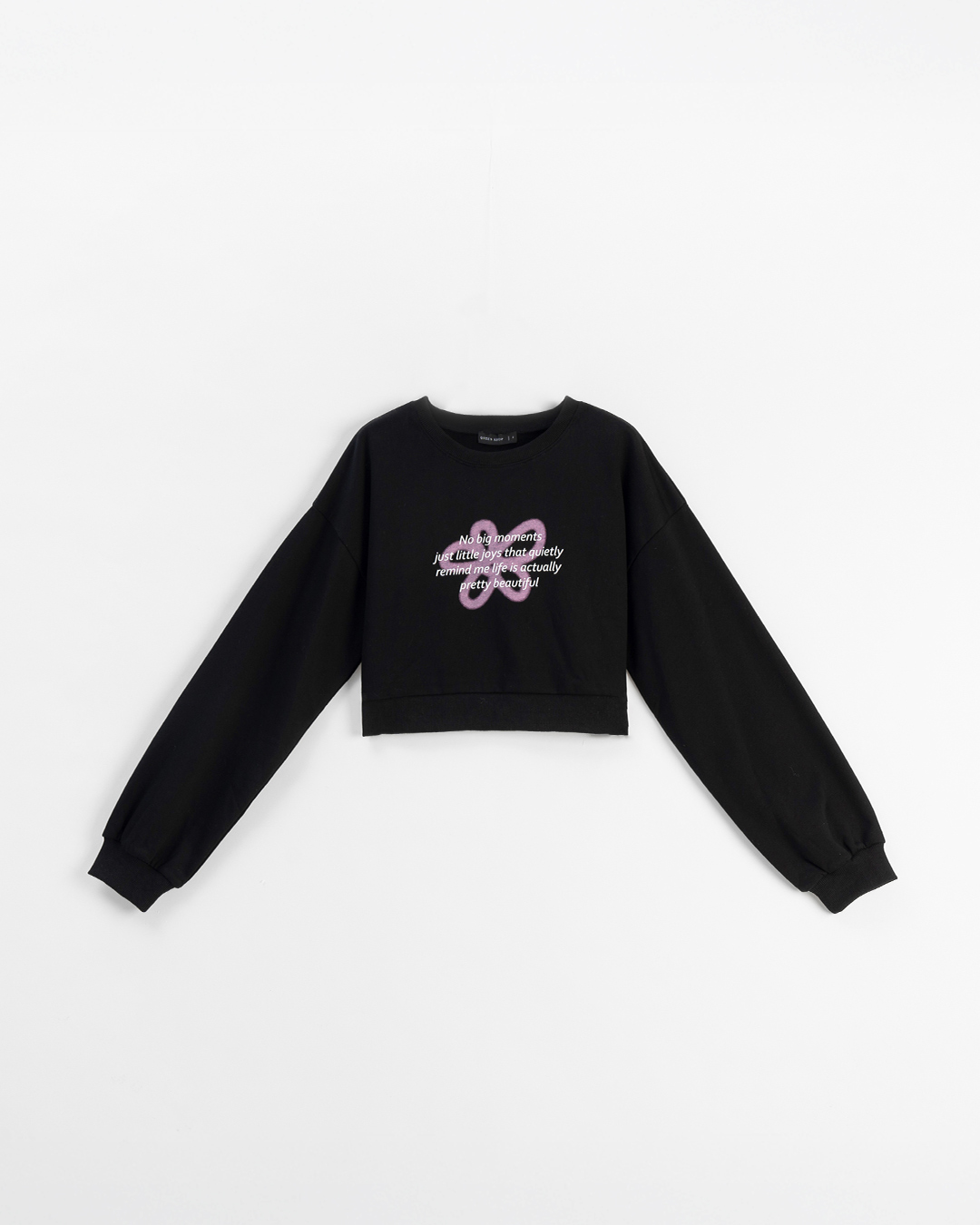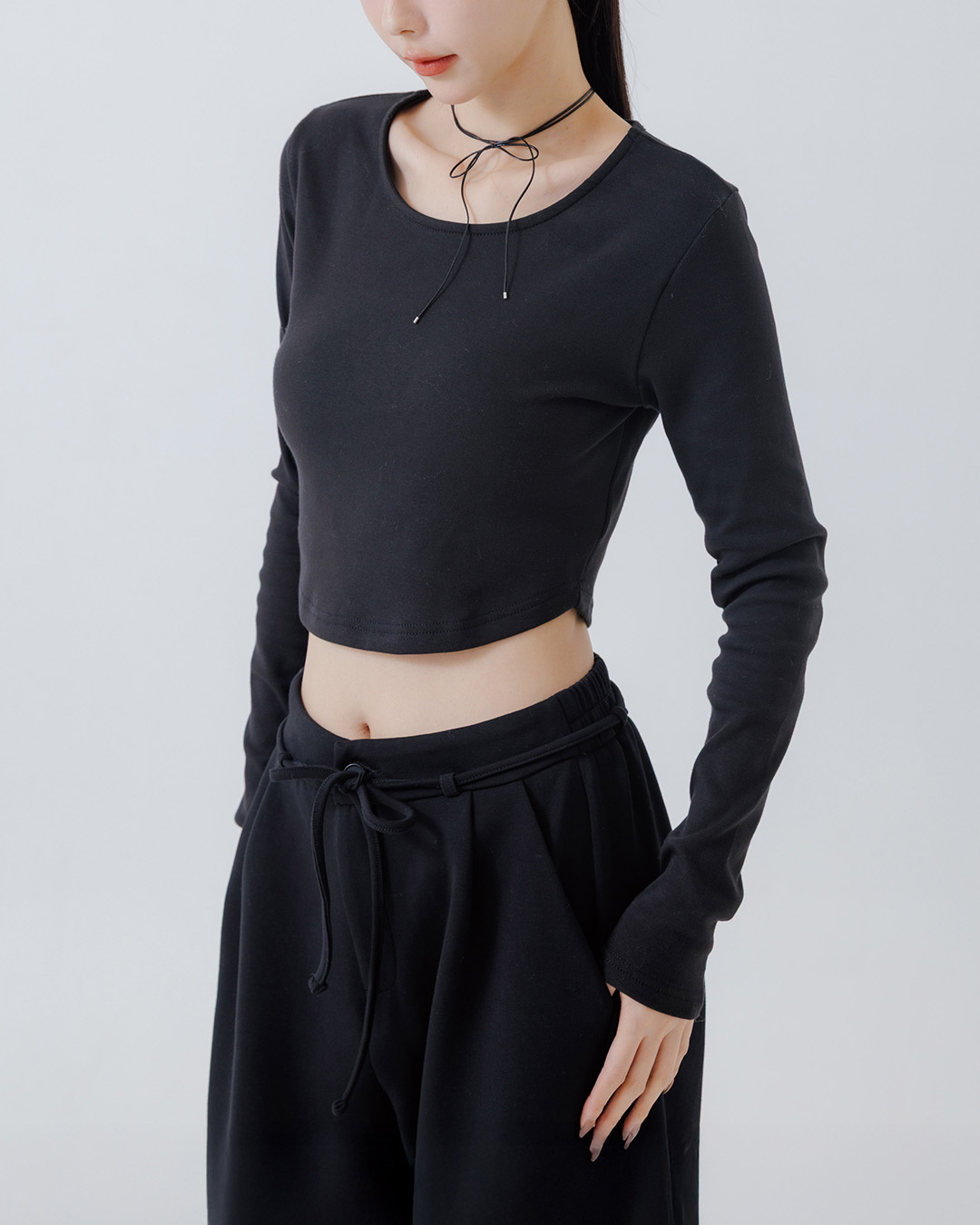 素面圓領短版造型長袖上衣-黑 S/M/L