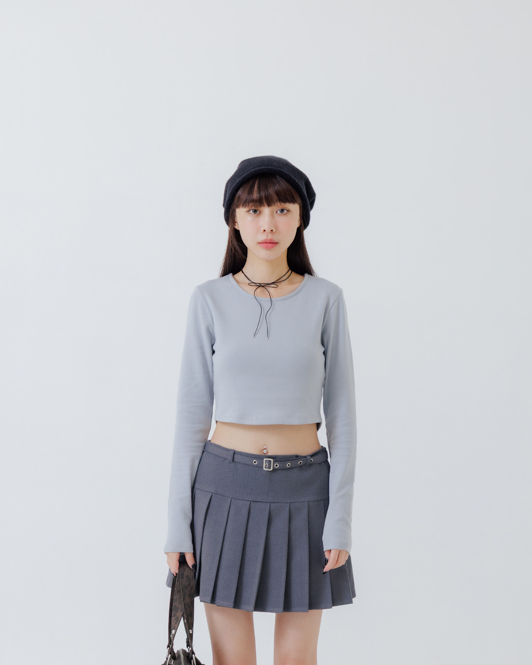 素面圓領短版造型長袖上衣-灰 S/M/L
