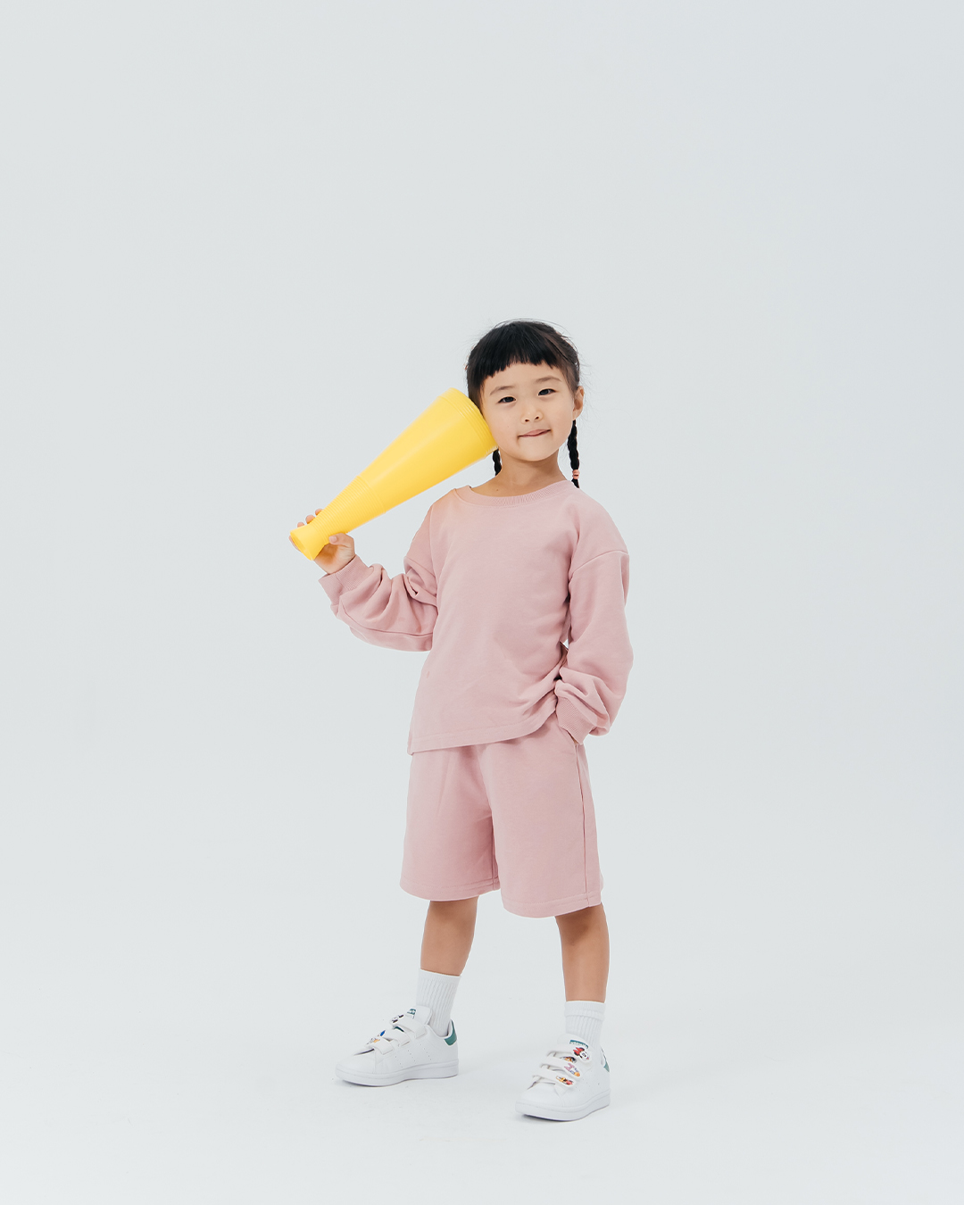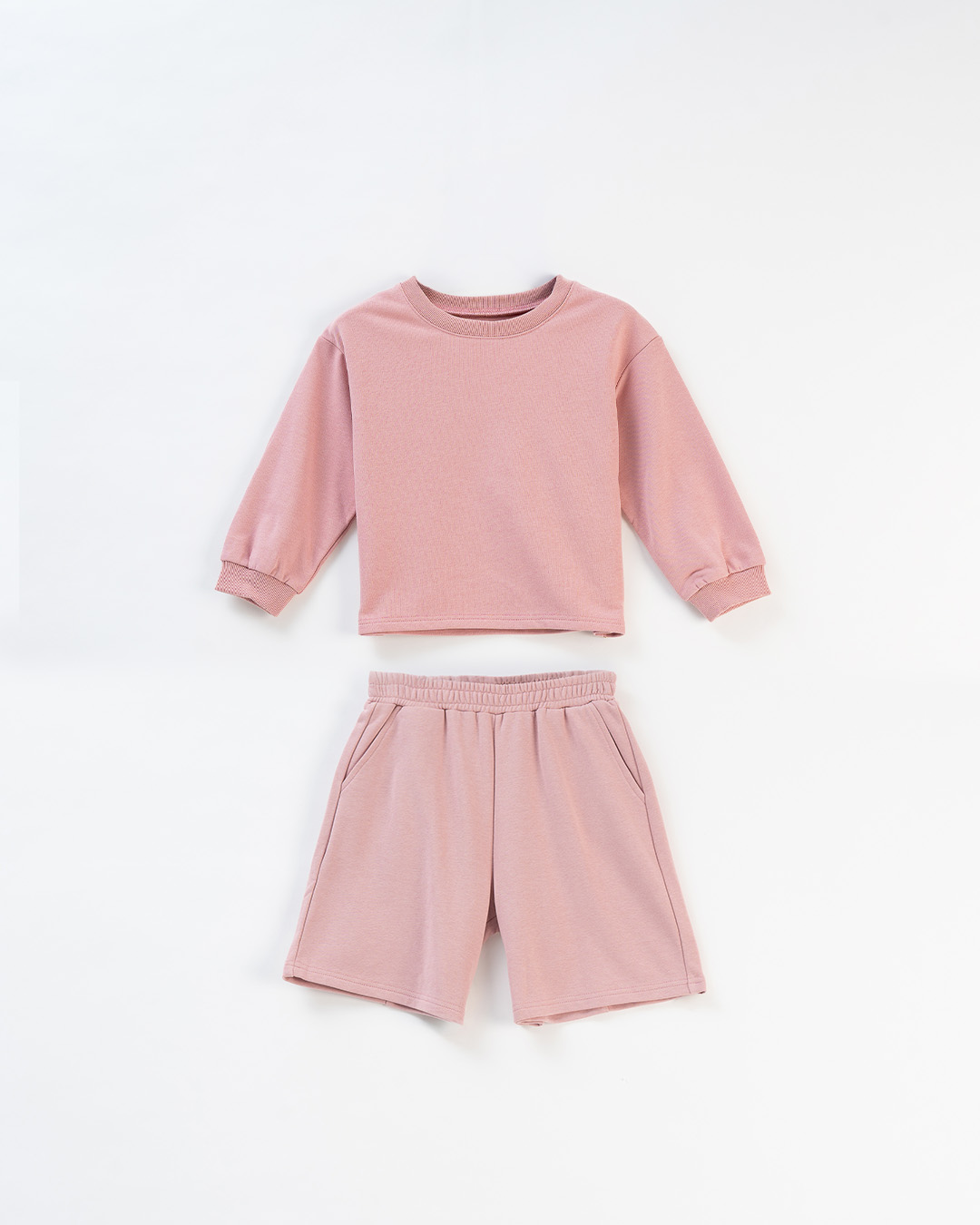 童裝 素面休閒長袖短褲套裝-粉 M/L/XL