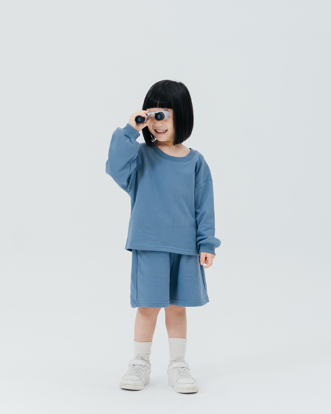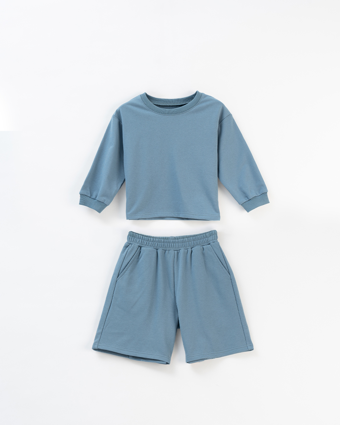 童裝 素面休閒長袖短褲套裝-藍 M/L/XL