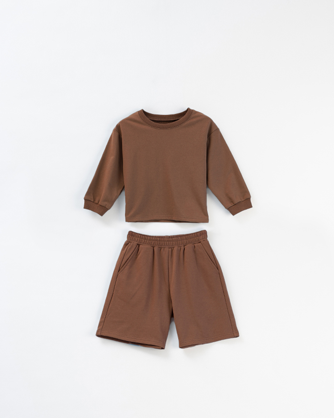 童裝 素面休閒長袖短褲套裝-咖啡 M/L/XL