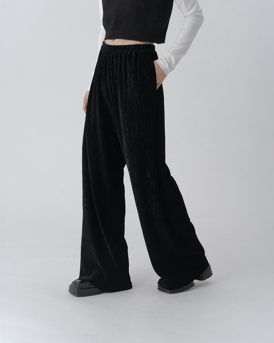光澤感壓褶直筒天鵝絨長褲-黑 S/M