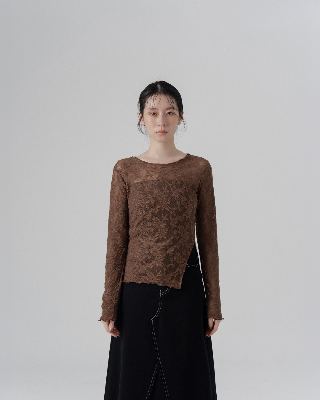 立體蕾絲緹花鏤空側抓皺上衣-咖啡