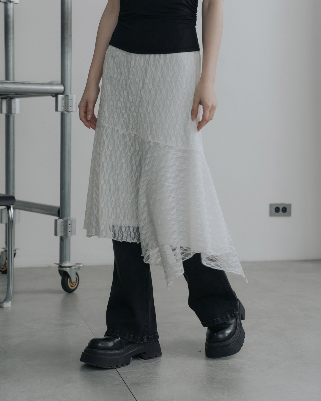 質感蕾絲不規則剪接設計七分長裙-黑 S/M