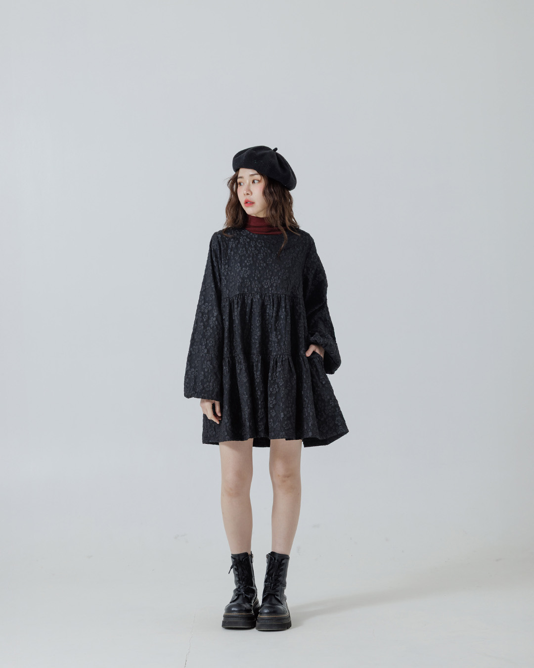質感緹花澎袖蛋糕短洋裝 兩色售