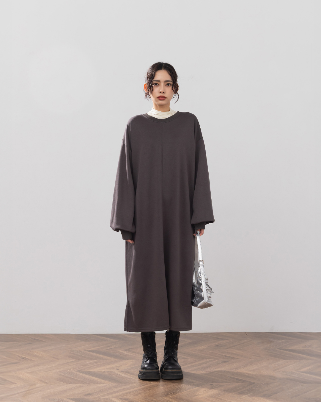 休閒圓領落肩造型寬版長洋裝 兩色售
