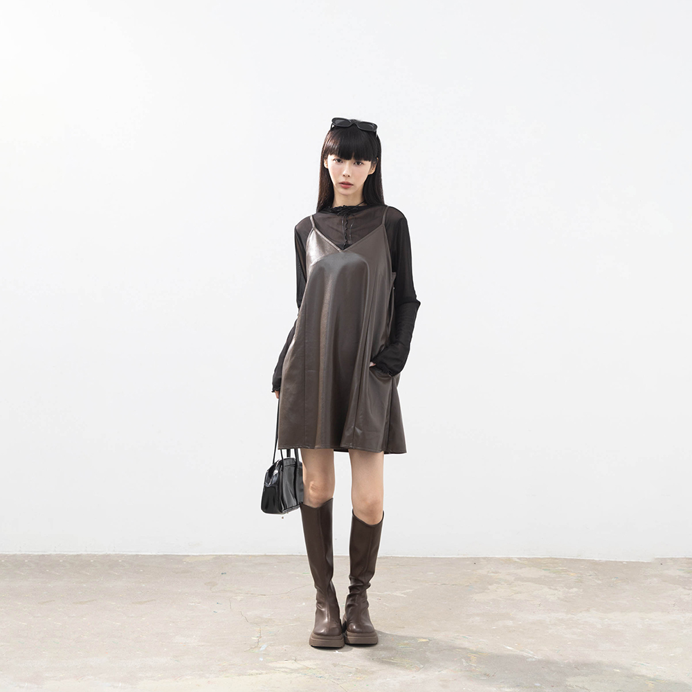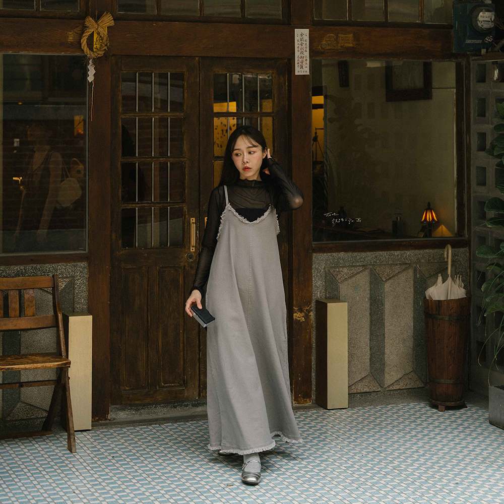 微光澤透膚設計細肩長罩衫洋裝 兩色售