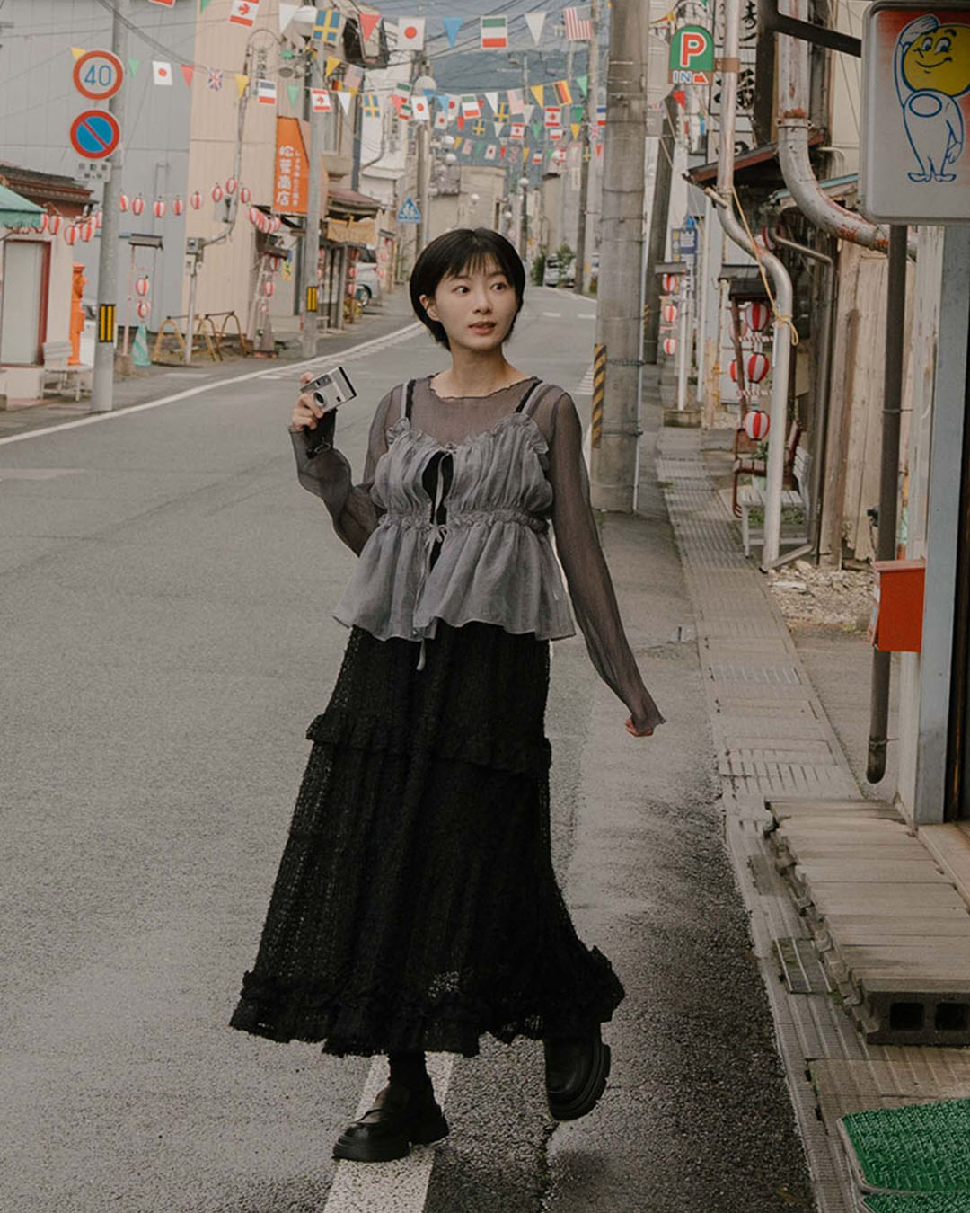 波點荷葉傘襬澎袖透膚上衣 兩色售