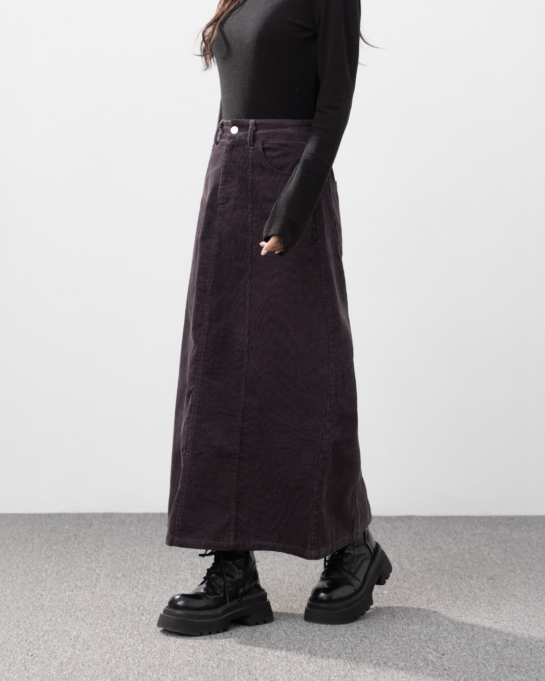 剪接設計直筒燈芯絨長裙-灰 S/M/L