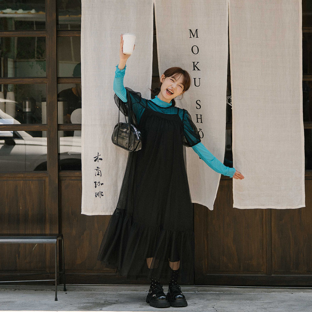 澎袖造型網紗兩件式長洋裝 兩色售 S/M