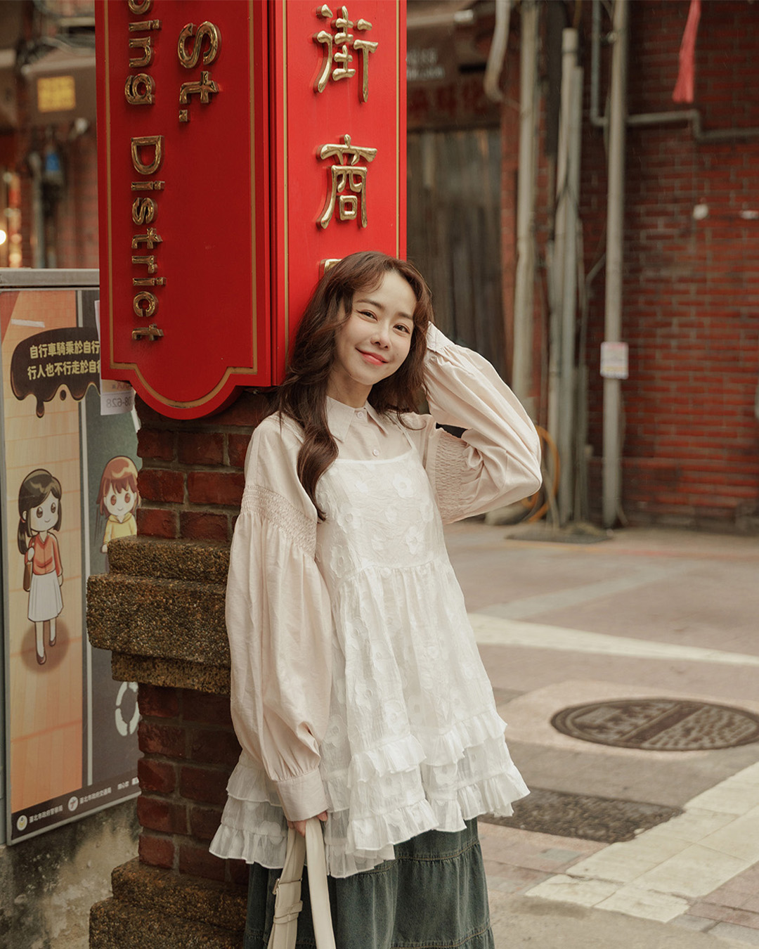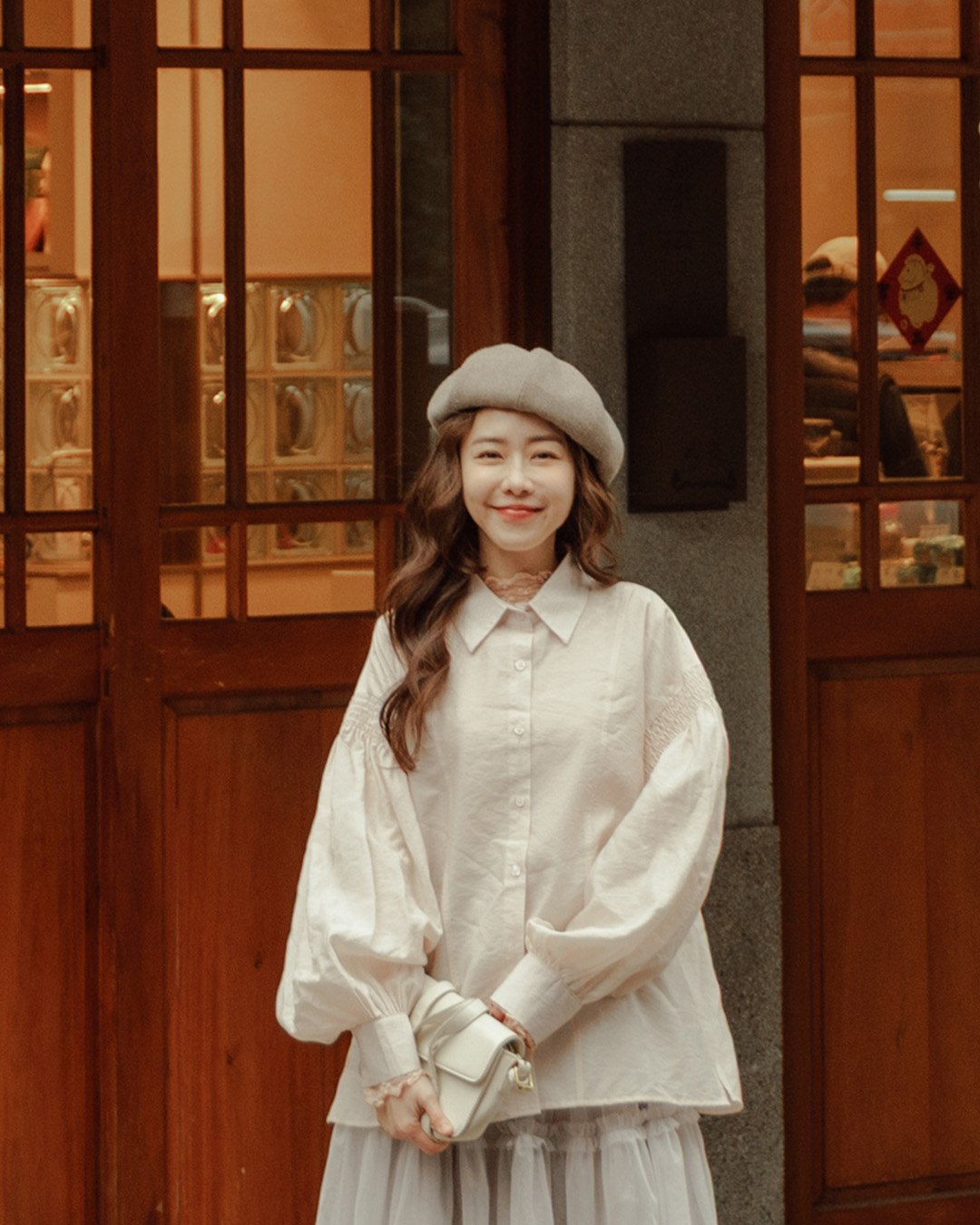 抓皺澎袖設計透膚剪接長袖襯衫 三色售